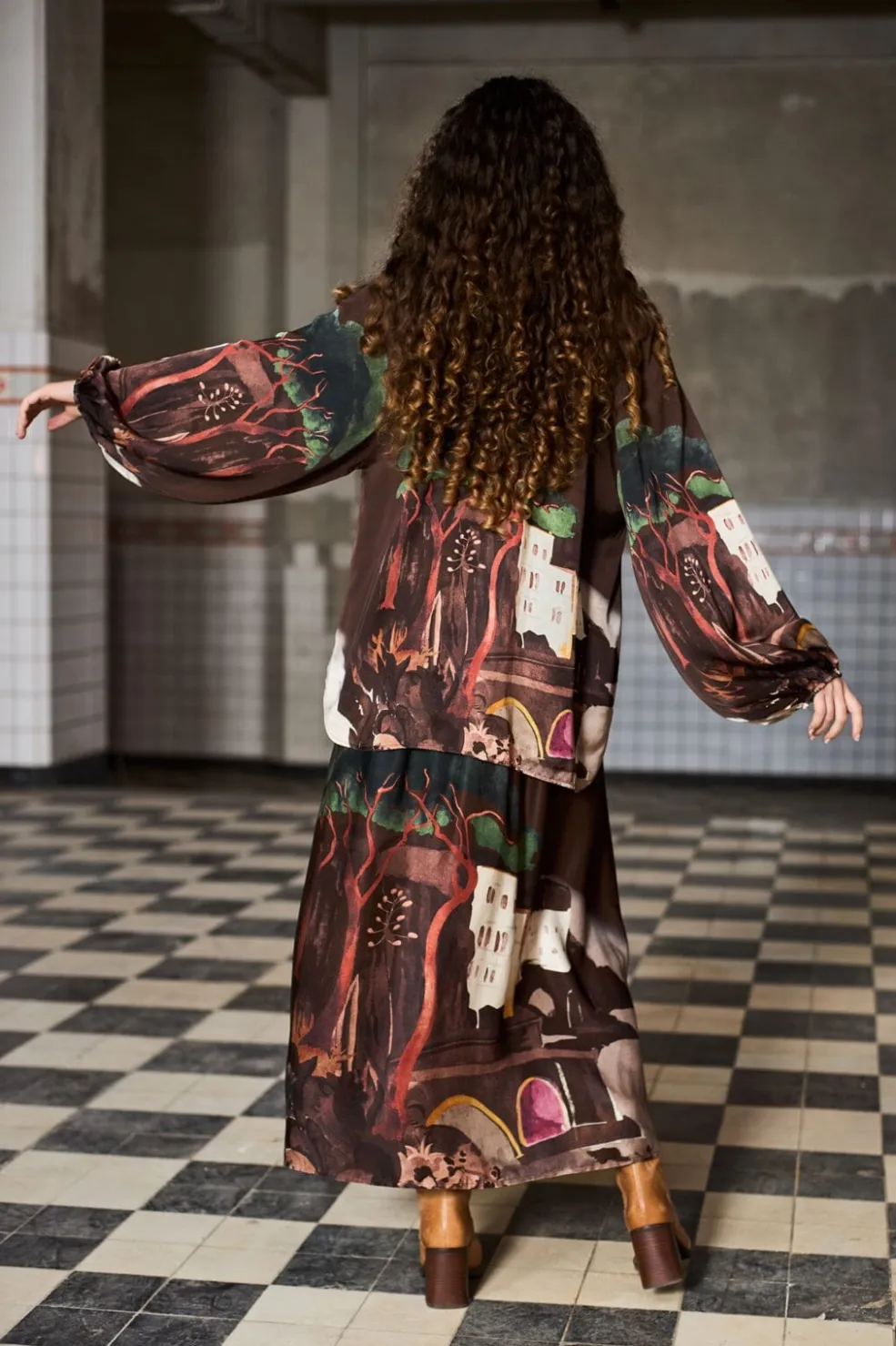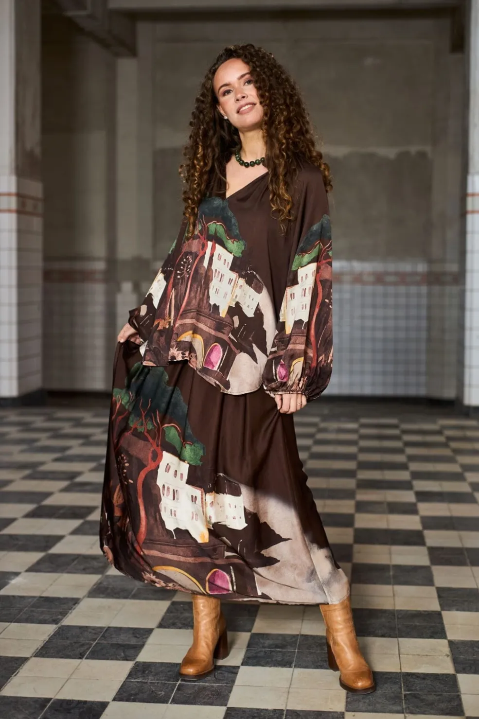 Brun bluse fra Black Colour med kunstnerisk bymotiv. Den løse model har V-udskæring og lange ærmer med elastik ved håndleddene. Mønstret viser bygninger og træer i flere farver.