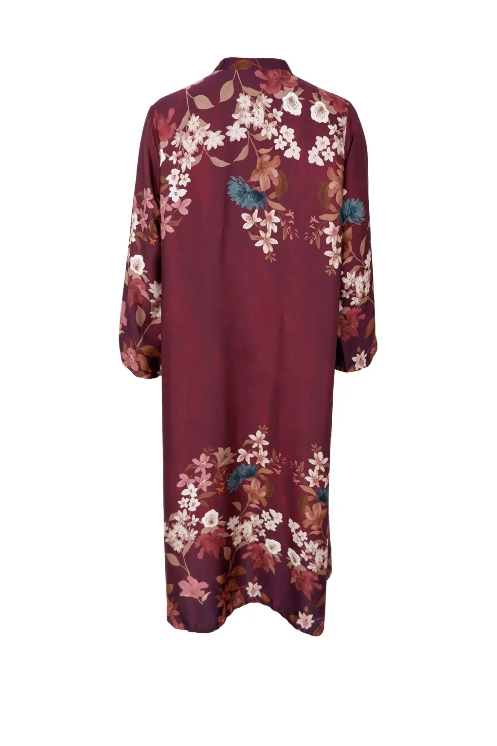 Satinkjole fra Black Colour i bordeaux med blomstermønster. Kjolen har skjortekrave, knapper hele vejen ned foran og 3/4 ærmer. Den løse model går til midt på læggen.