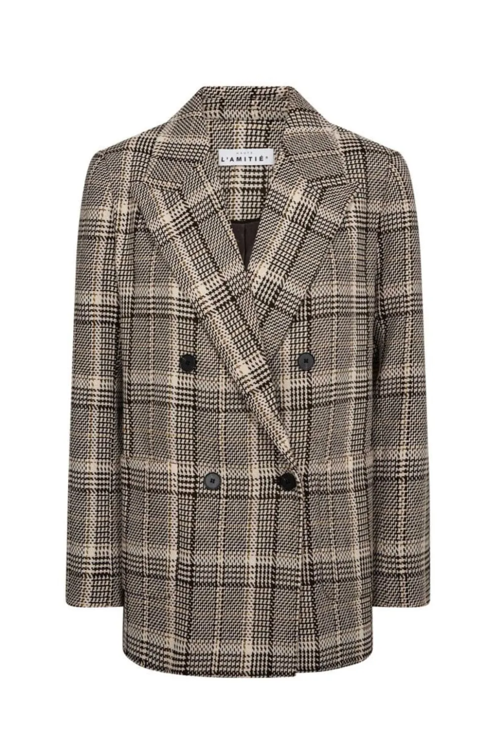 Ternet blazer fra Haute L’Amitié i brun nuancer. Blazeren har et dobbeltknappet design med to rækker af knapper foran og lange ærmer.