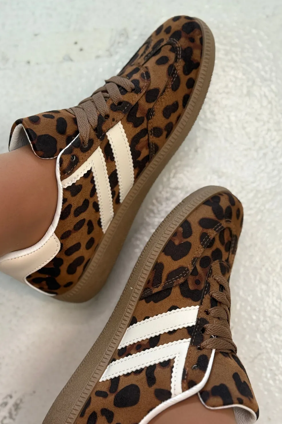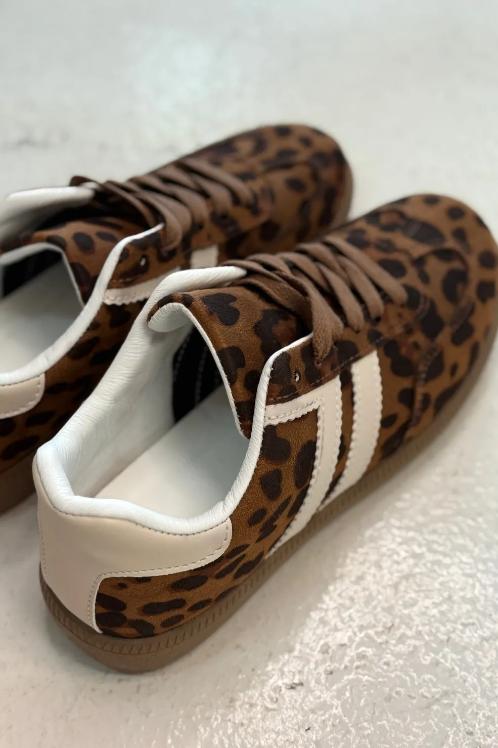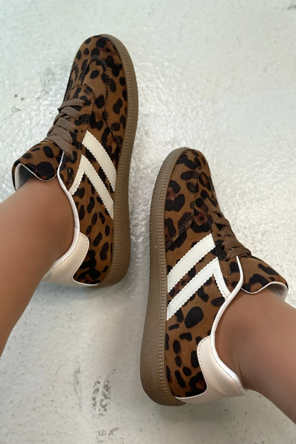 Sneakers fra Bloom med leopardmønster i brune og sorte farver. De har hvide striber på siderne og lysebrune såler.