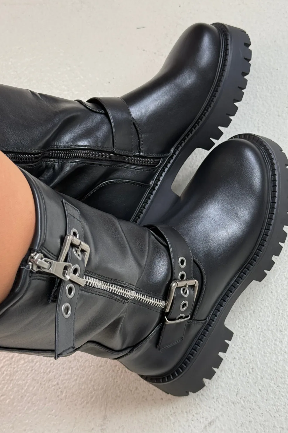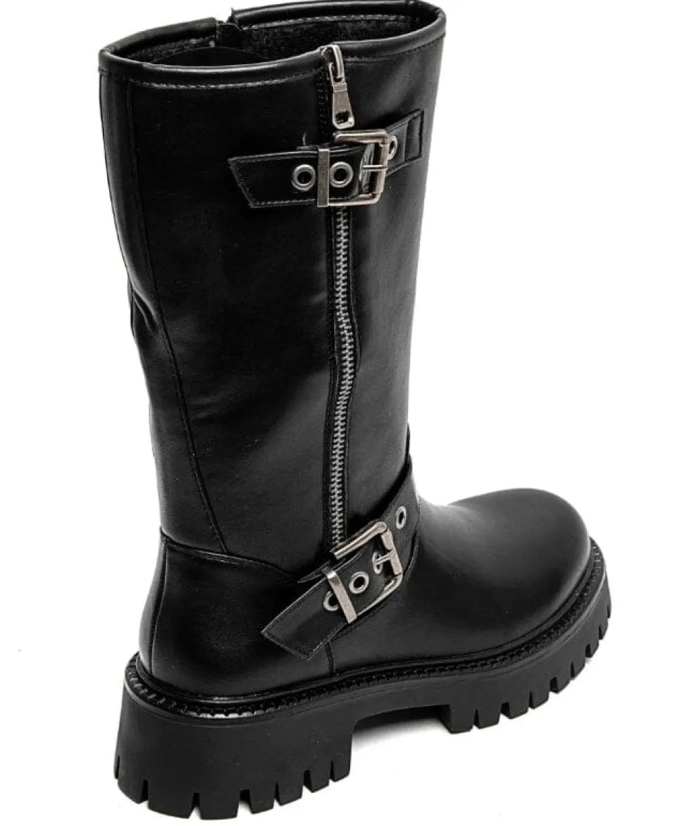 Sorte støvler fra Bloom, lavet af syntetisk materiale. Støvlerne har en kraftig sål, lynlås på siden og remme med spænder.