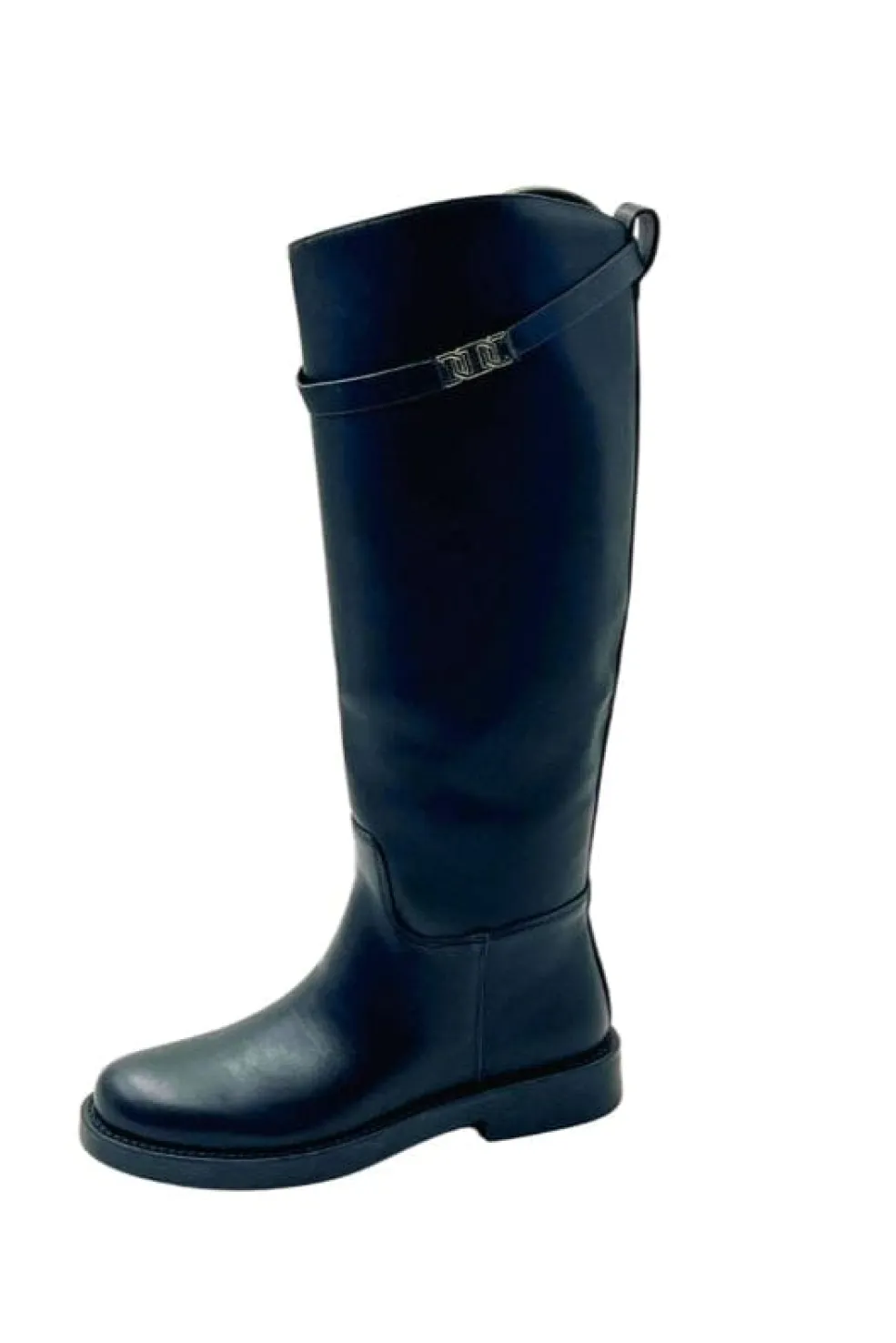 Sorte støvler fra Bloom med højt skaft og en dekorativ rem med metaldetalje øverst.
