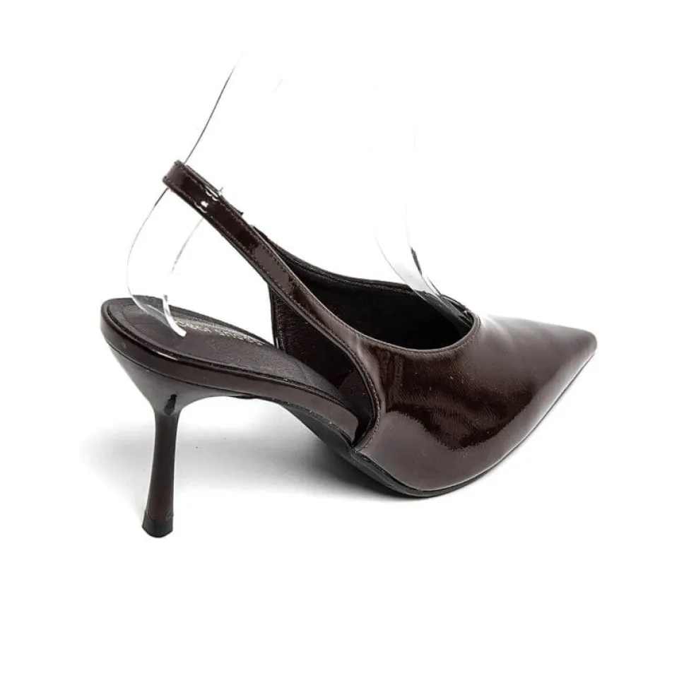 Stilet fra Bloom i mørk maroon med en skinnende overflade. Skoen har en spids tå og en slingback-rem med spænde og elastik.