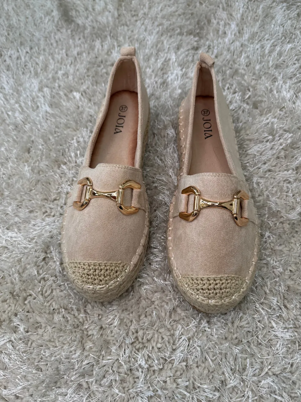 Beige espadrilles fra Bloom med lav hæl og guldfarvet metalspænde. Skoene har en flettet kant forneden og er lavet i tekstil med en mandelformet tå.