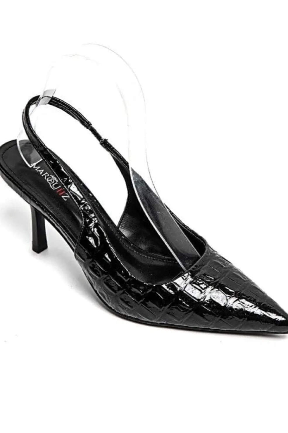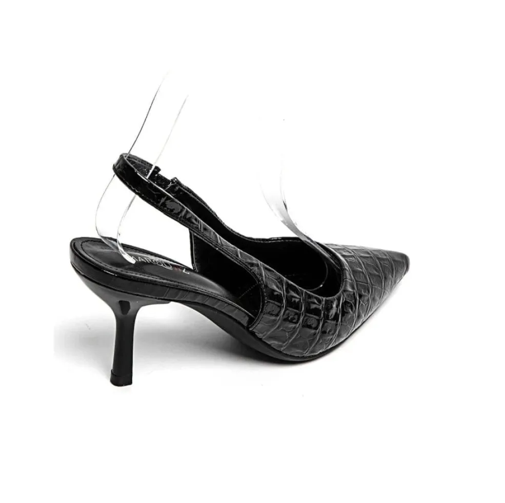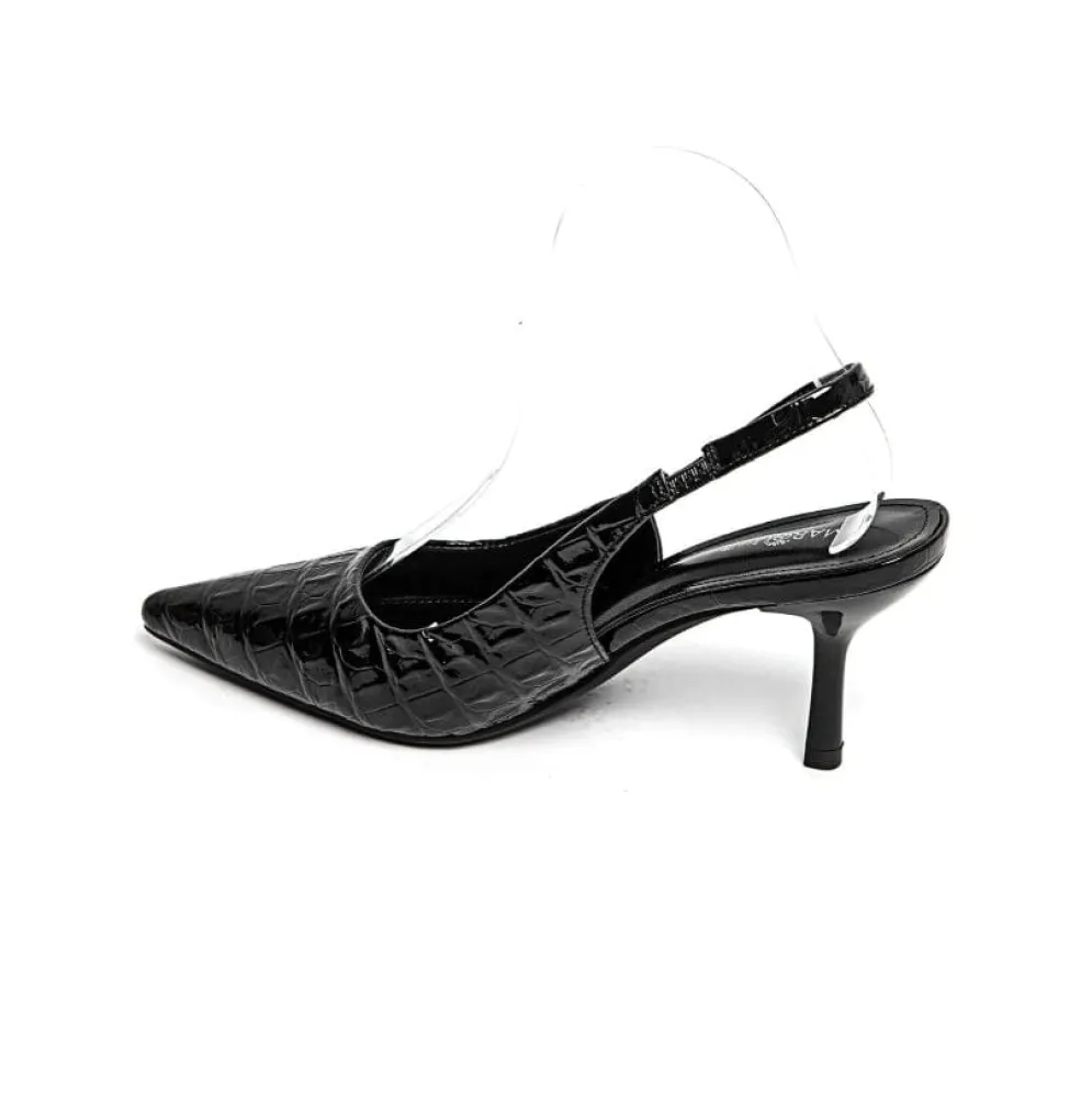 Sort stilet fra Bloom med blank, struktureret overflade. Skoen har en spids tå og en hælhøjde på 5-8 cm.