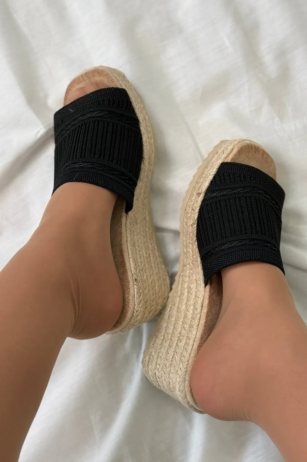 Sort sandal fra Bloom med en flettet espadrilles-sål og kilehæl. Den brede rem i strækbart materiale giver god støtte over foden.
