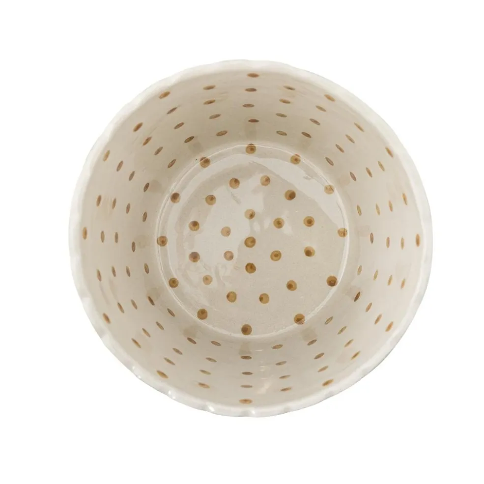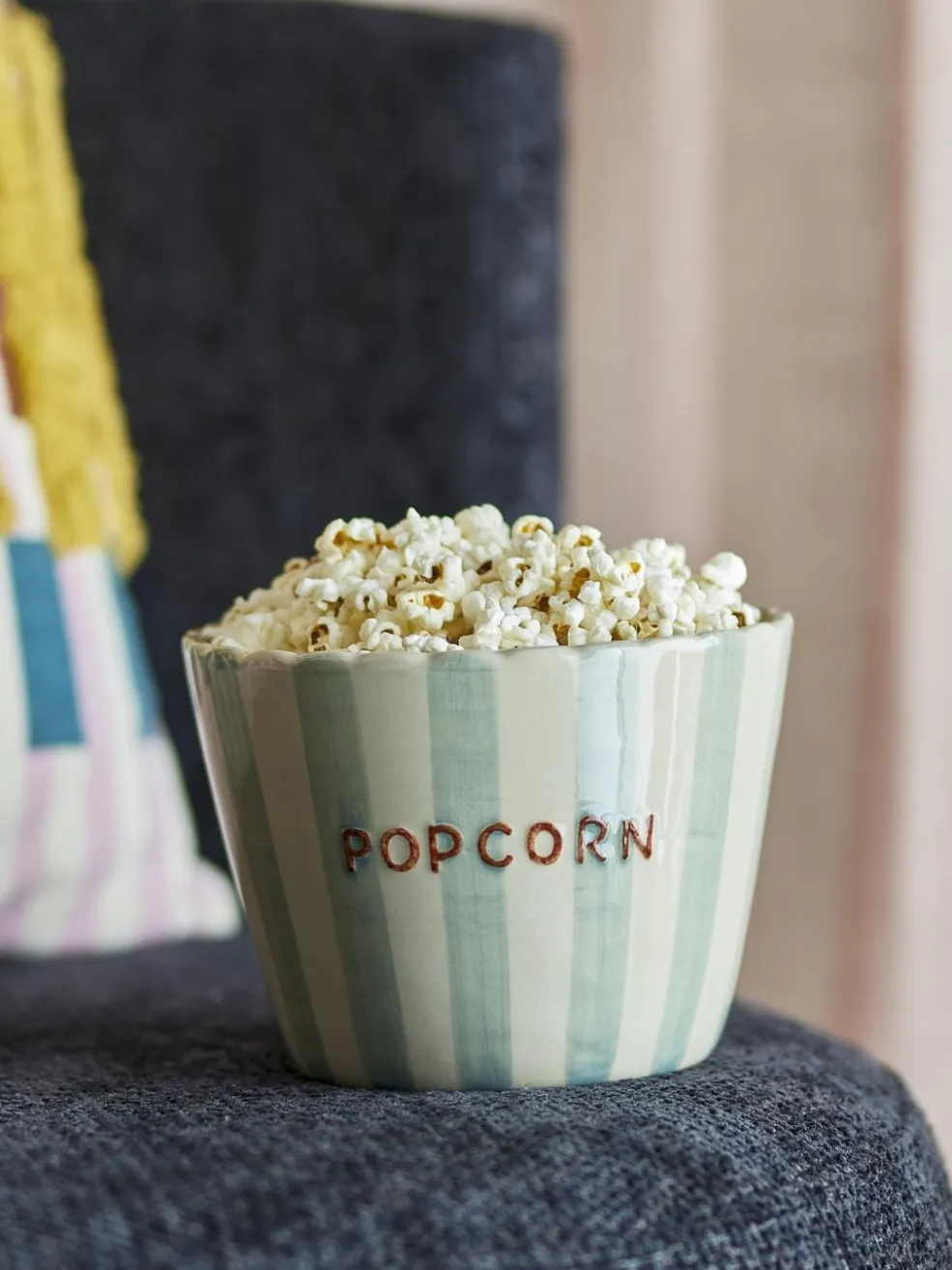 Skål fra Bloomingville, fremstillet af stentøj med håndmalede striber og teksten POPCORN. Kanten er bølget, og indersiden har beige prikker. Små variationer i mønsteret kan forekomme.