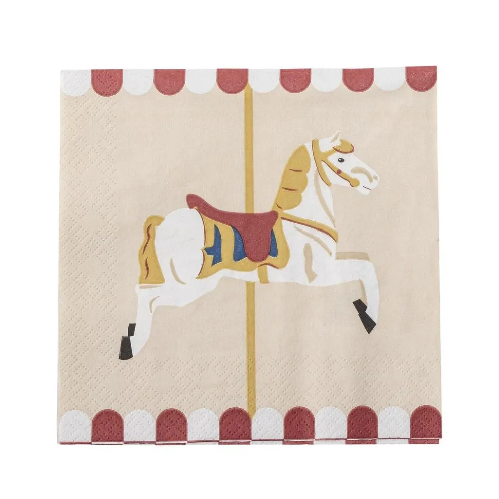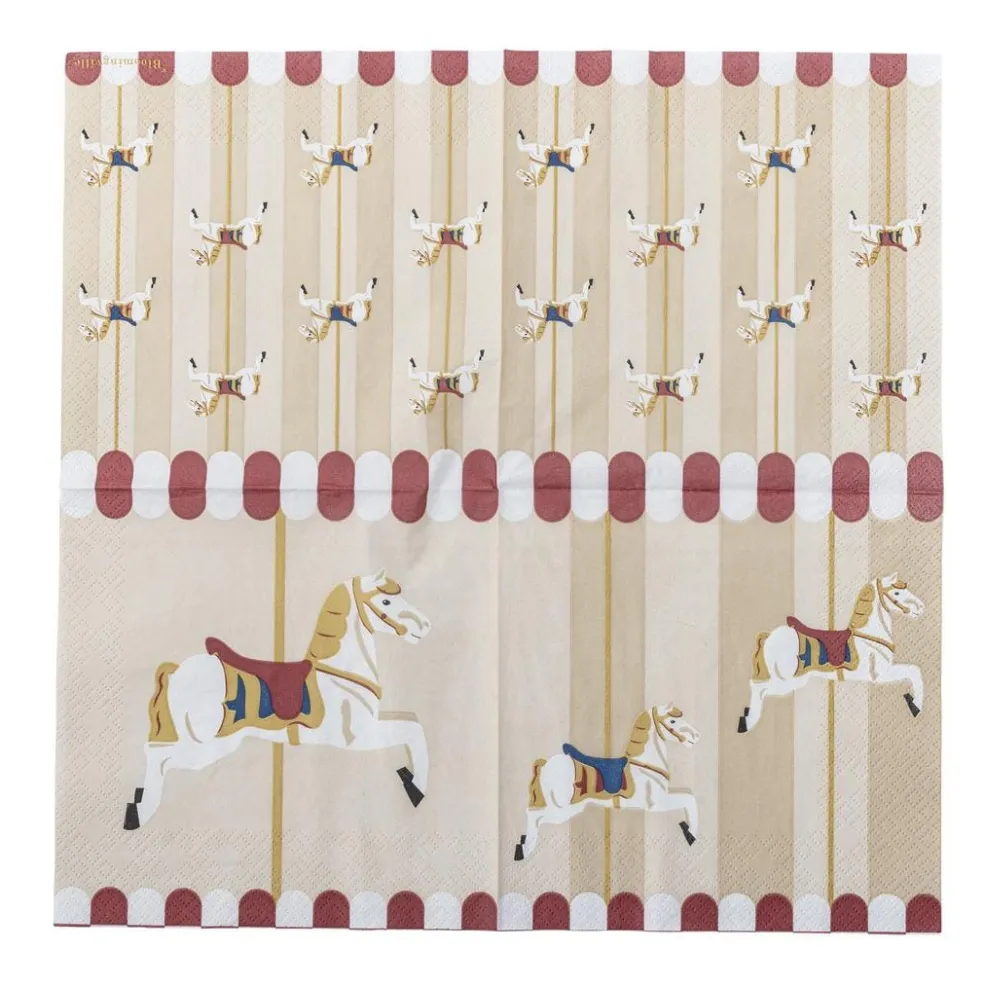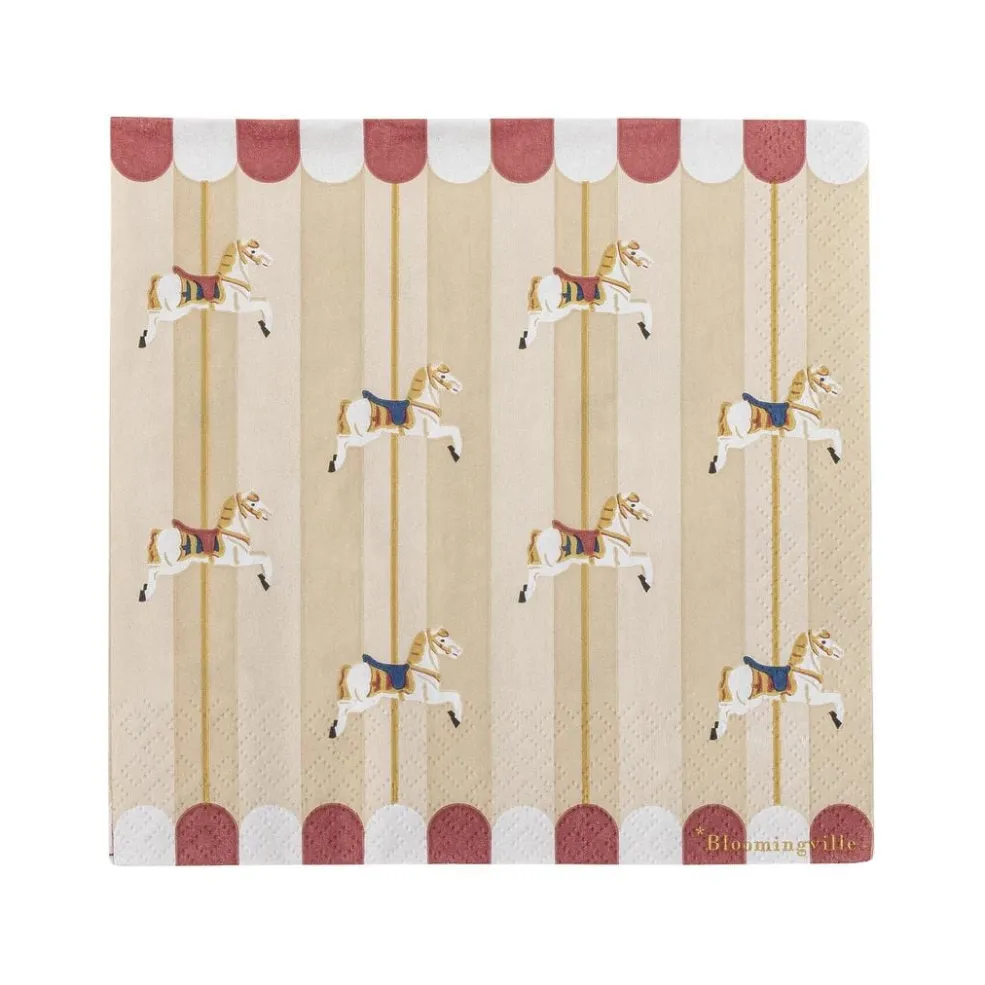 Merry-go-round servietterne fra Bloomingville kommer i en pakke med 20 smukke papirsservietter, prydet med forskellige karruselmotiver. Disse servietter tilføjer et legende og nostalgisk touch til julebordet eller andre festlige lejligheder og skaber en hyggelig atmosfære.