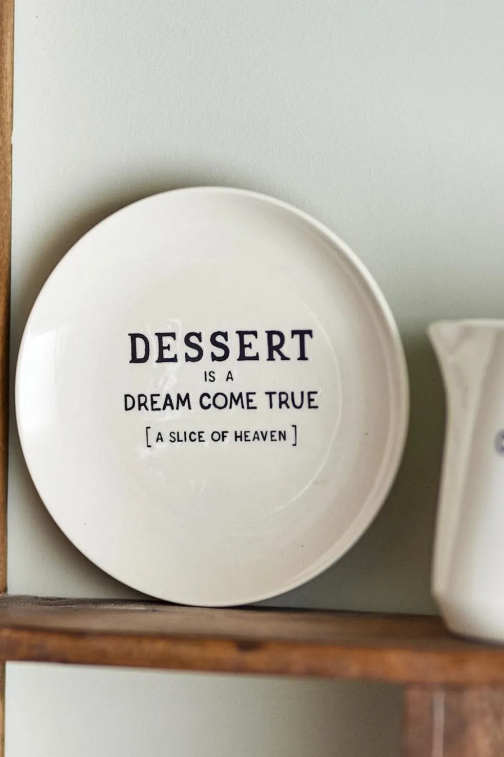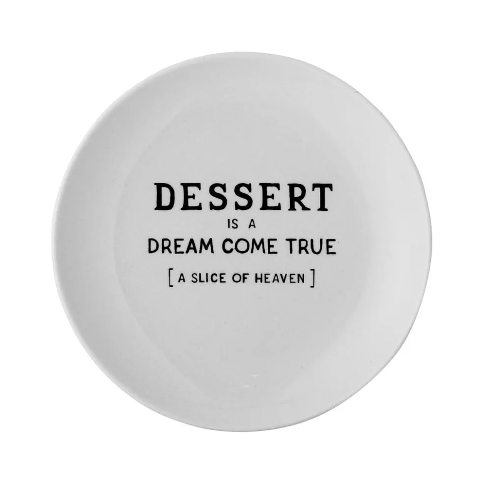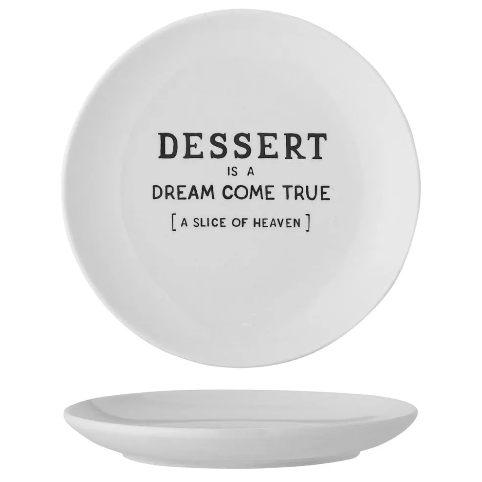 Hvid desserttallerken fra Bloomingville i stentøj med sort tekst. Den runde tallerken har citatet Dessert is a dream come true, a slice of heaven trykt på overfladen.
