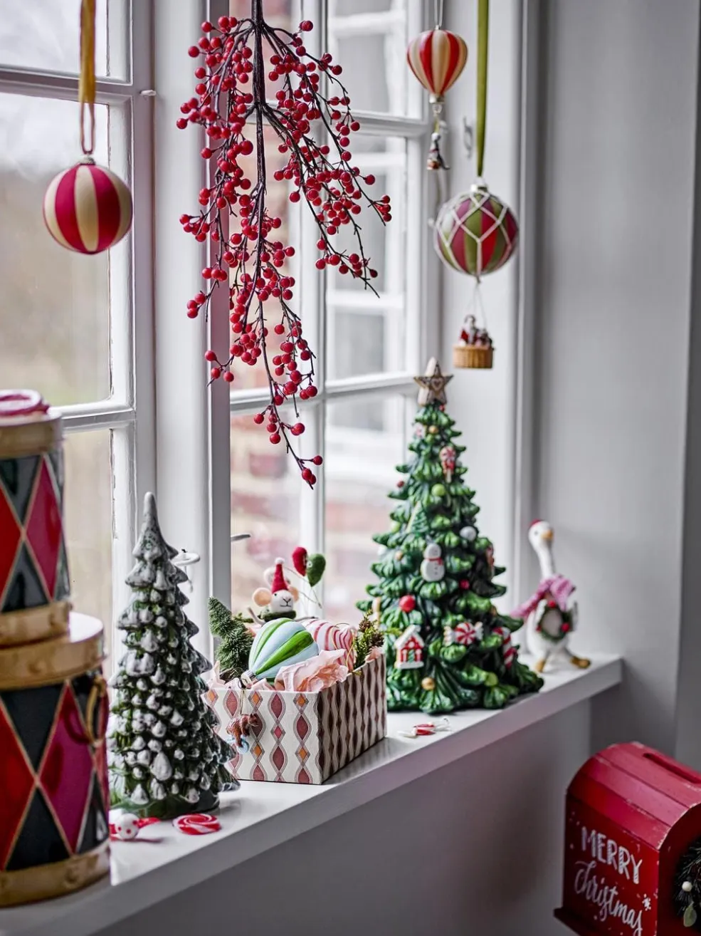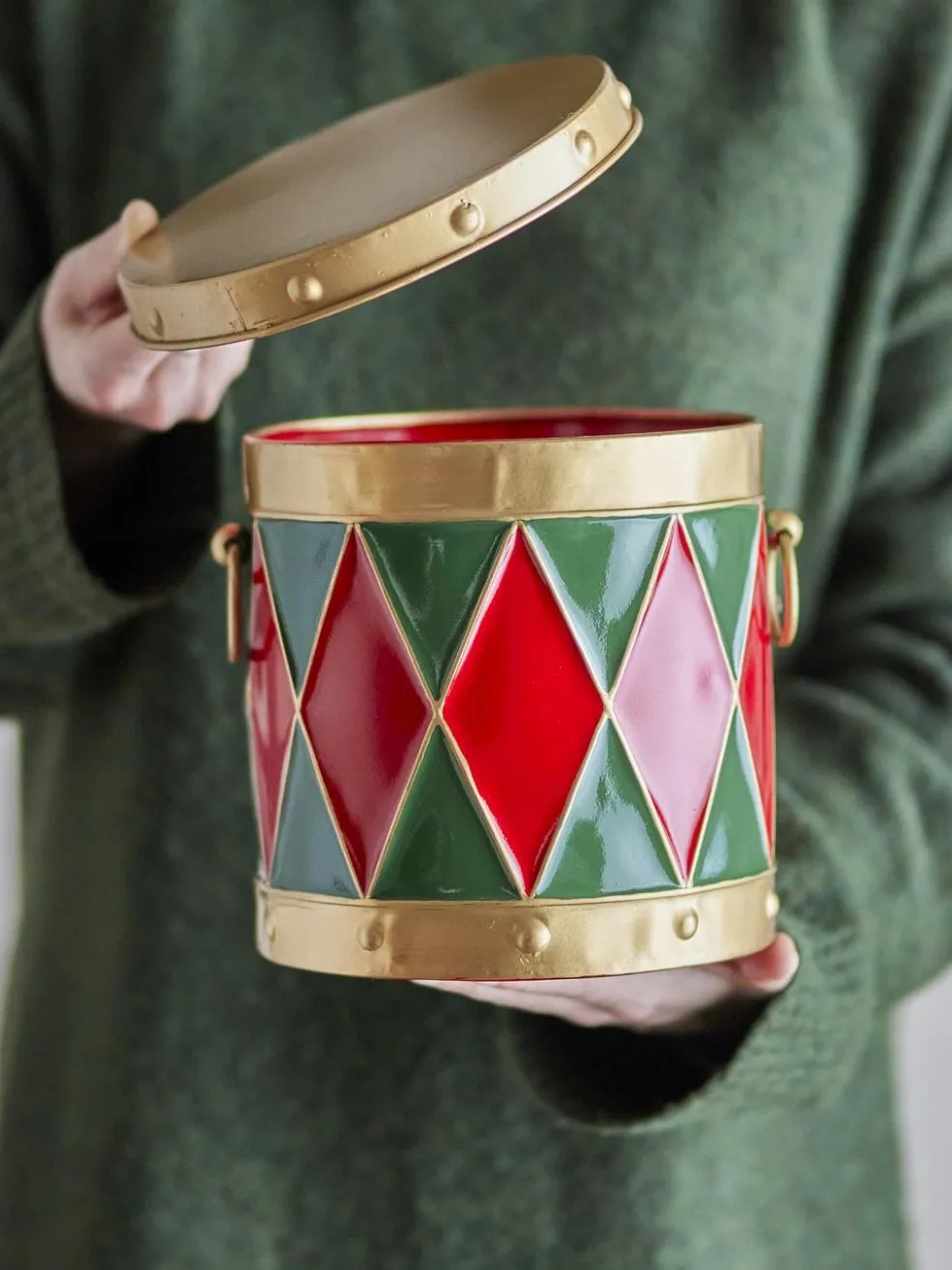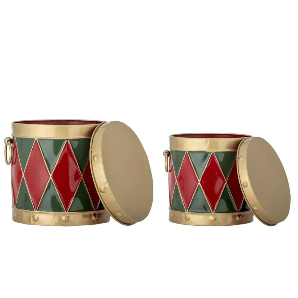 Trommeformet metalæske fra Bloomingville med rødt og grønt diamantmønster samt gulddetaljer. Sættet består af to æsker med aftagelige låg.