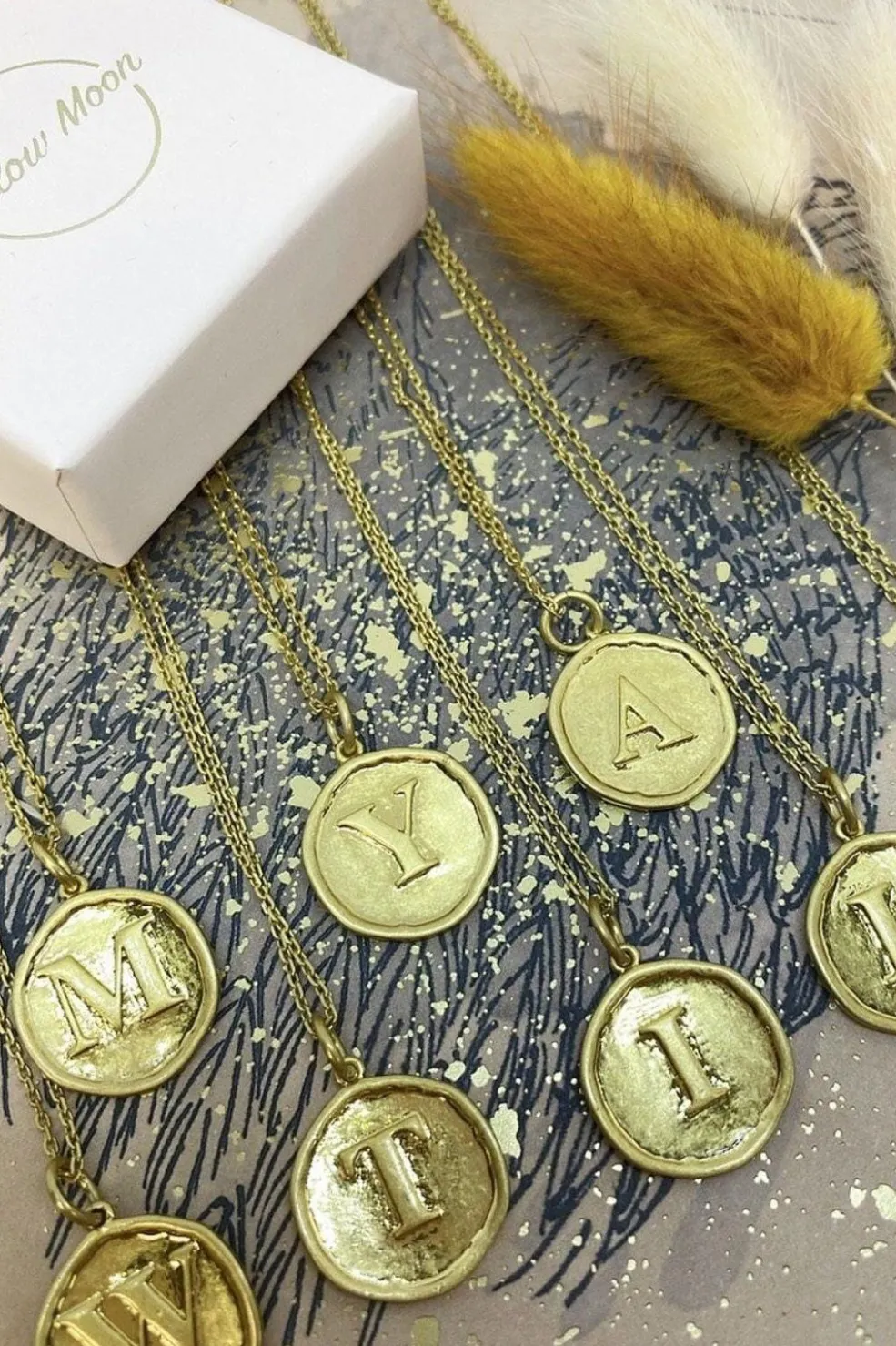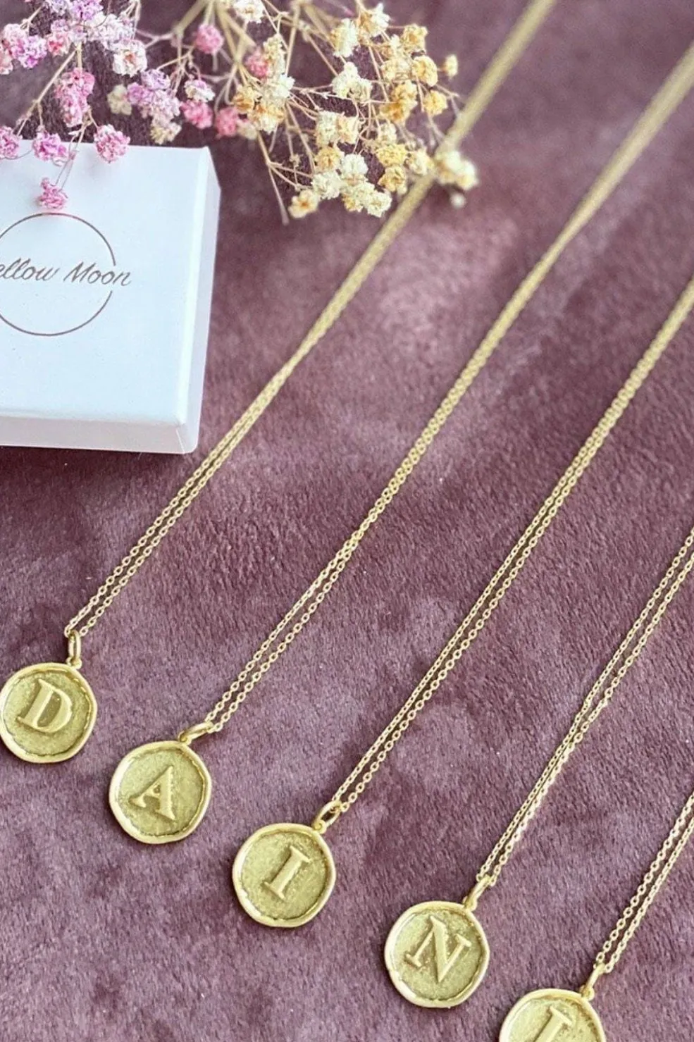 Bogstavkæde fra Mellow Moon med et rundt vedhæng til personligt bogstav. Kæden er lavet af messing med 18 karat forgyldning og har et enkelt, rent design.