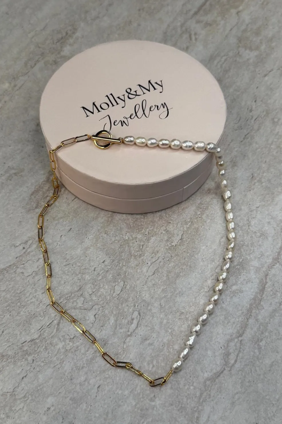 Halskæde fra Molly&My Jewellery med perler på den ene halvdel og en guldfarvet kæde med aflange led på den anden halvdel.