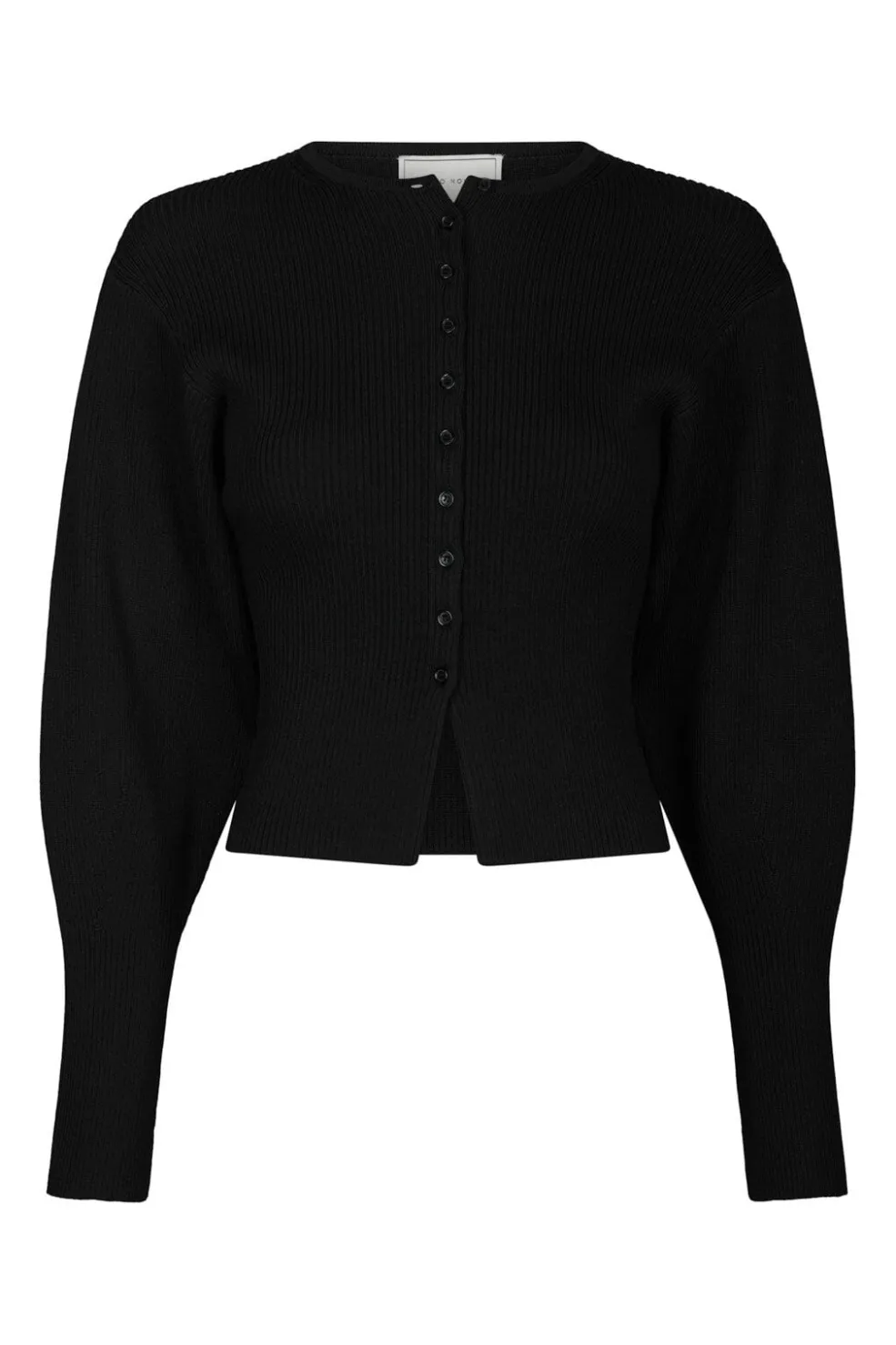 Sort strikket cardigan fra Neo Noir med ribbet tekstur. Den har en tætsiddende pasform, rund halsudskæring og knapper hele vejen ned foran.