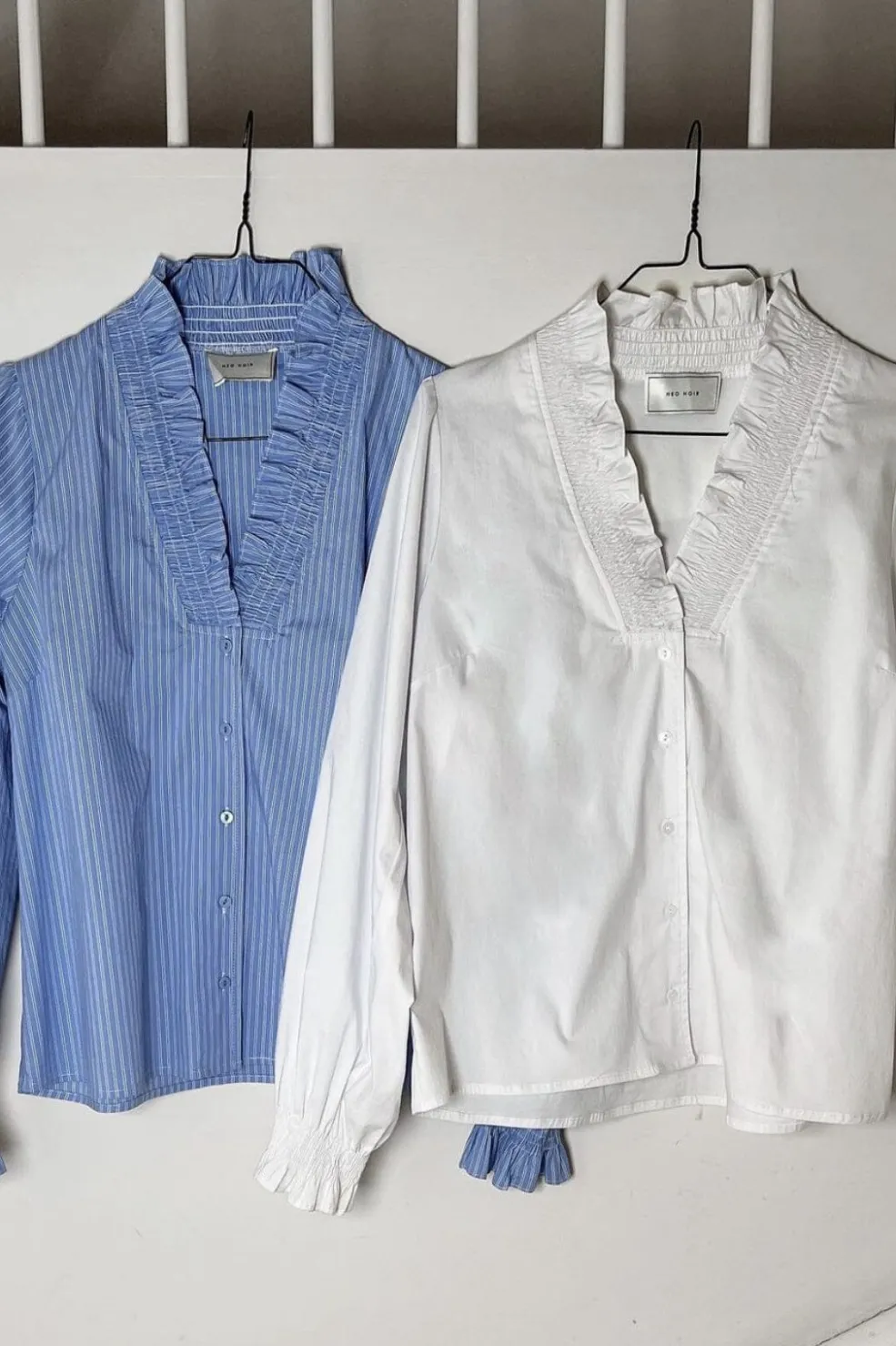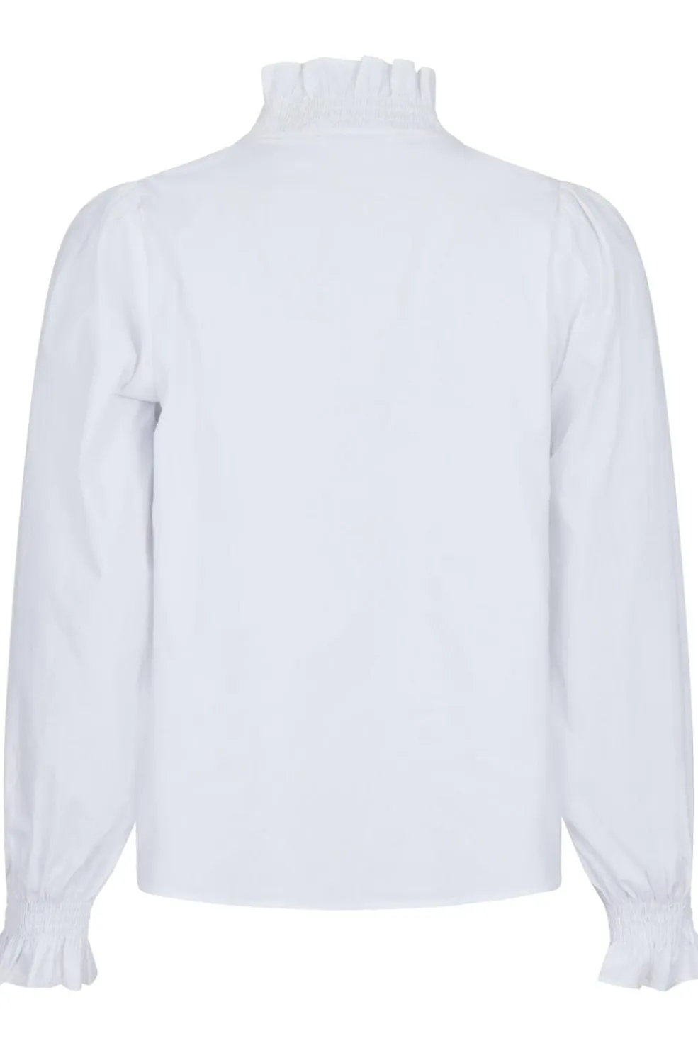Hvid skjorte fra Neo Noir med flæsekrave og knaplukning foran. Skjorten har puffede ærmer med elastiske manchetter og dekorative syninger, der giver et feminint præg.