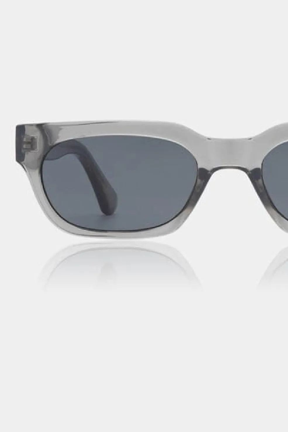 Solbriller fra A. Kjærbede i grå transparent med rektangulær form. Brillerne er lavet af Tritan Renew med mørke linser og har et gennemsigtigt stel.