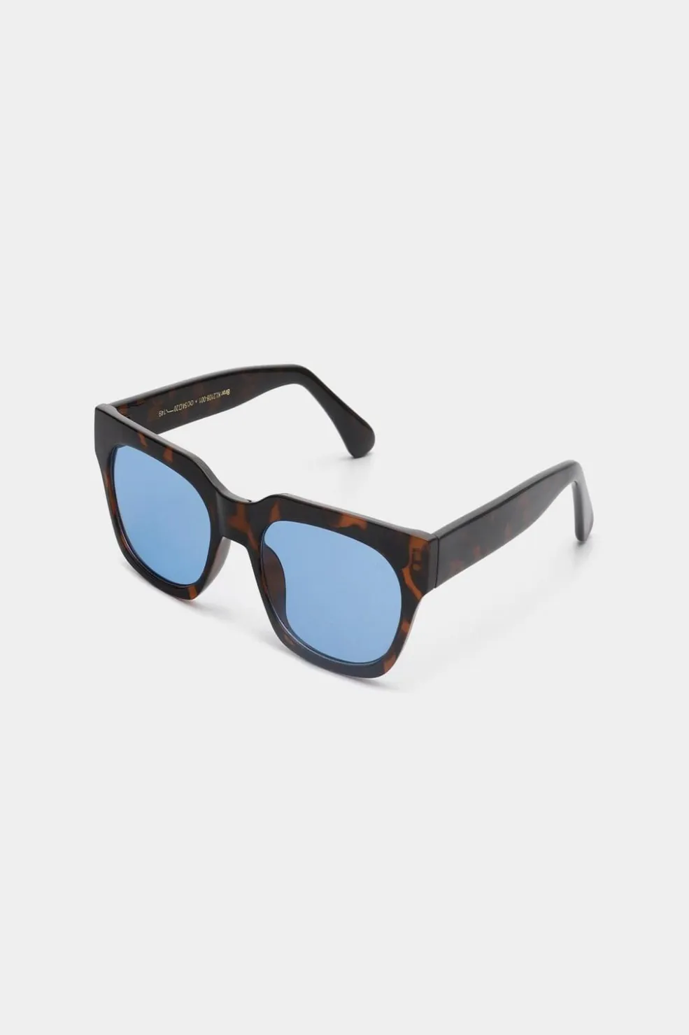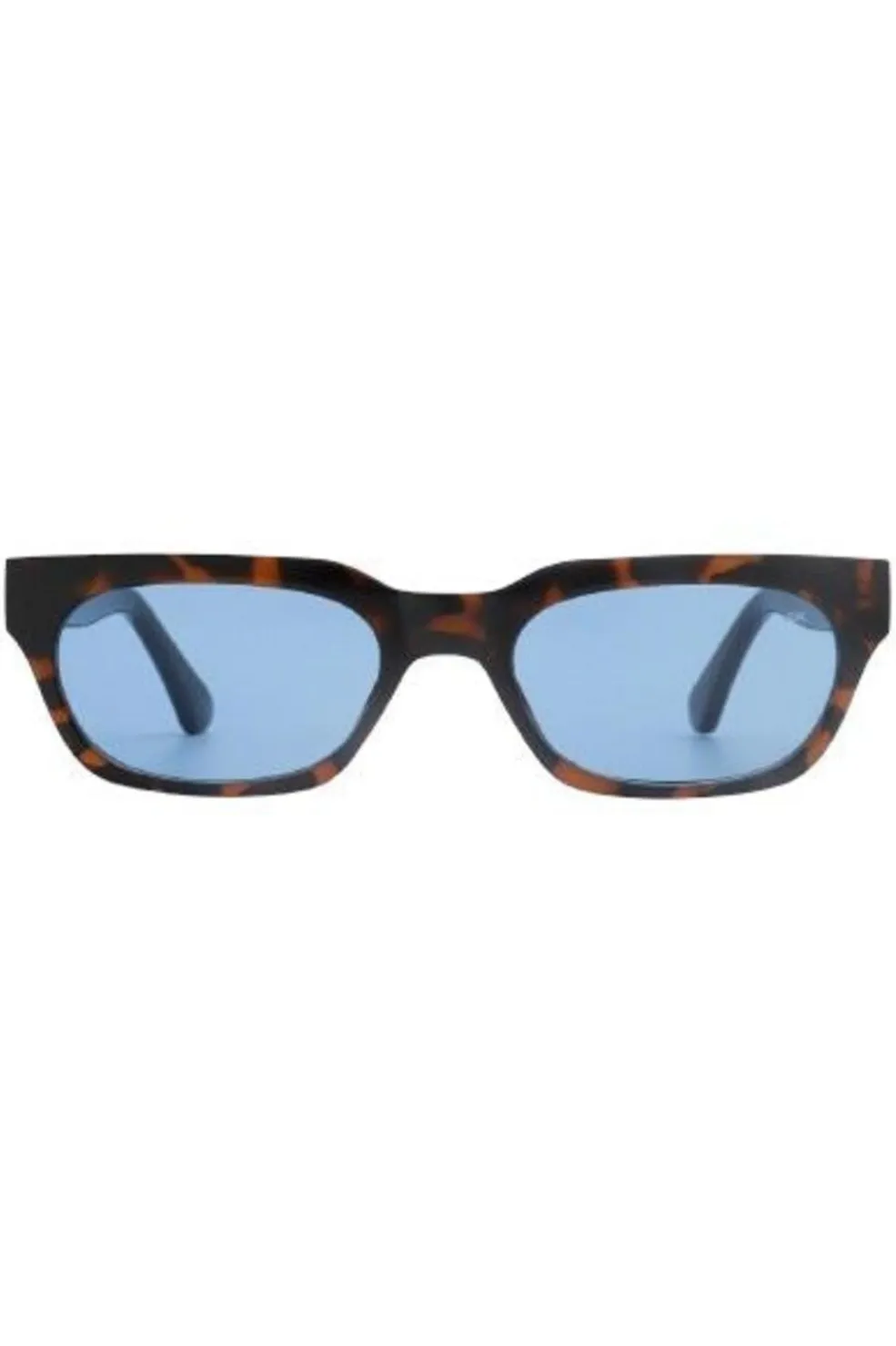 Rektangulære solbriller fra A. Kjærbede med brun tortoise-mønstret stel og blå linser. Solbrillerne har formbare stænger med metalkerner og 5-tønders optiske hængsler i høj kvalitet.