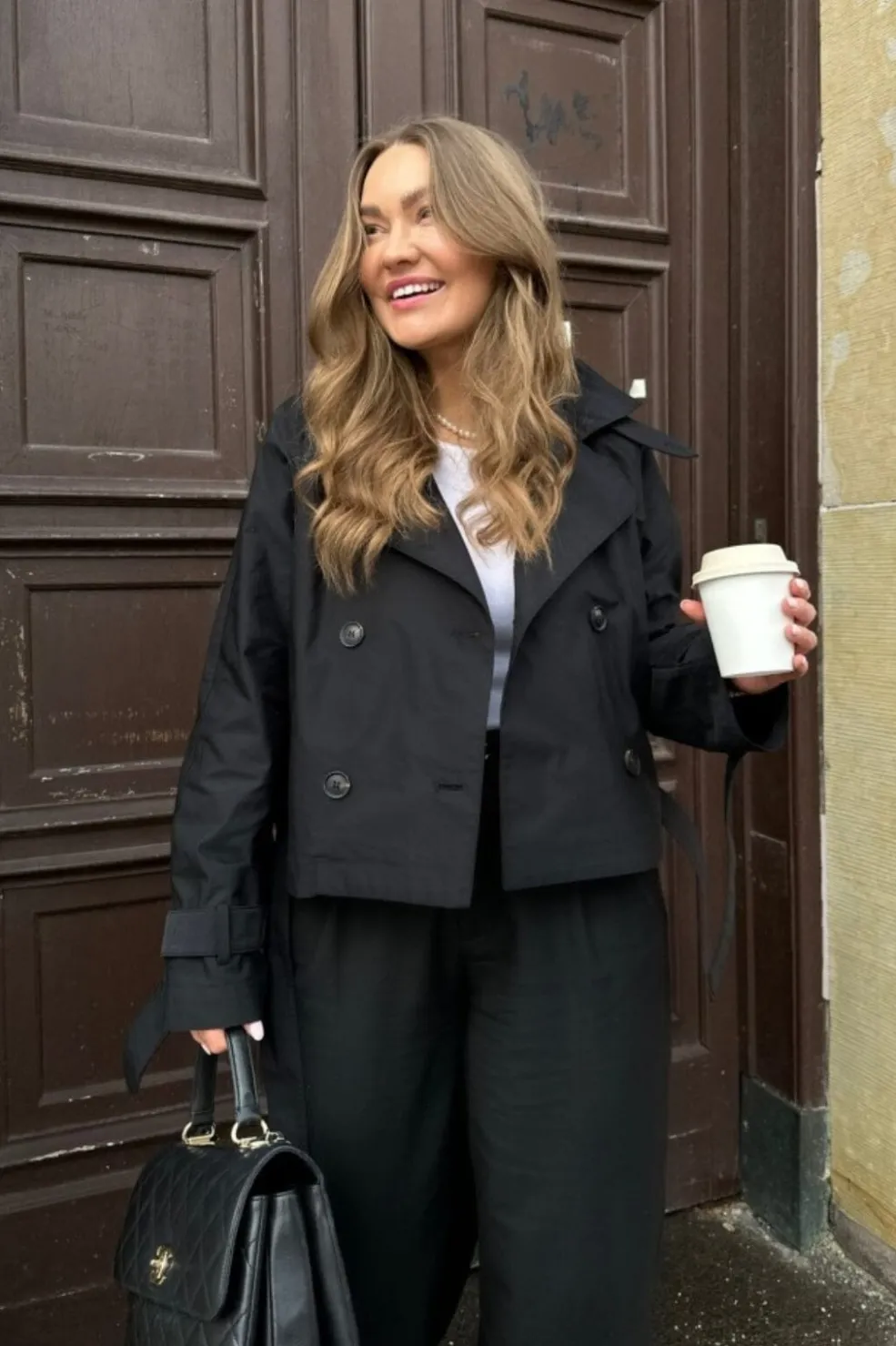 Sort trenchcoat med oversized pasform og dobbeltknaplukning. Den korte længde giver mulighed for forskellige stylingmuligheder, og bæltet kan justeres efter ønske.