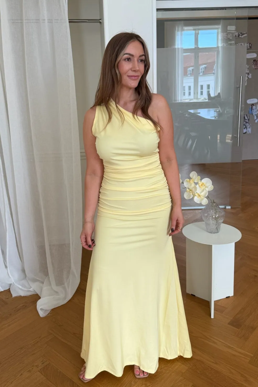 Gul maxikjole fra BYIC med one-shoulder design. A-formen og det strækbare stof giver kjolen en god bevægelighed. Flæsedetaljer langs siden og over skulderen skaber en fin detalje.