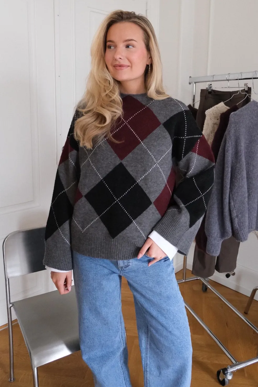 Pullover fra BYIC med argyle-mønster i grå, sort og bordeaux. Den har en løs, boxy pasform med rund halsudskæring og lange ærmer.