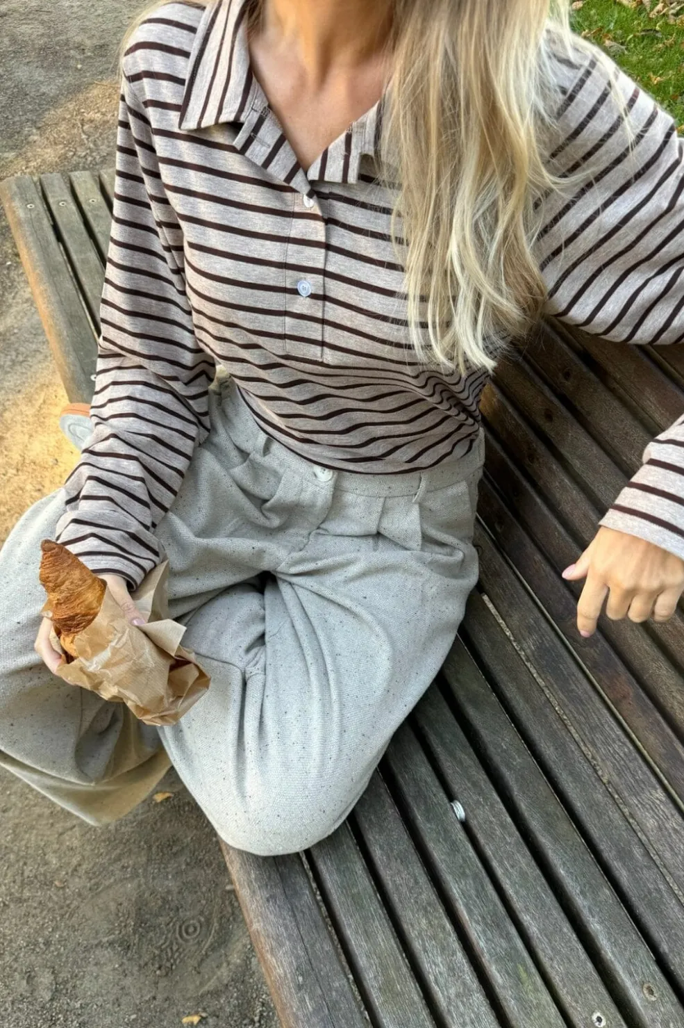 Stribet polo fra BYIC i beige og brun. Den har en polokrave i hvid og tre knapper foran. De lange ærmer har matchende hvide manchetter.