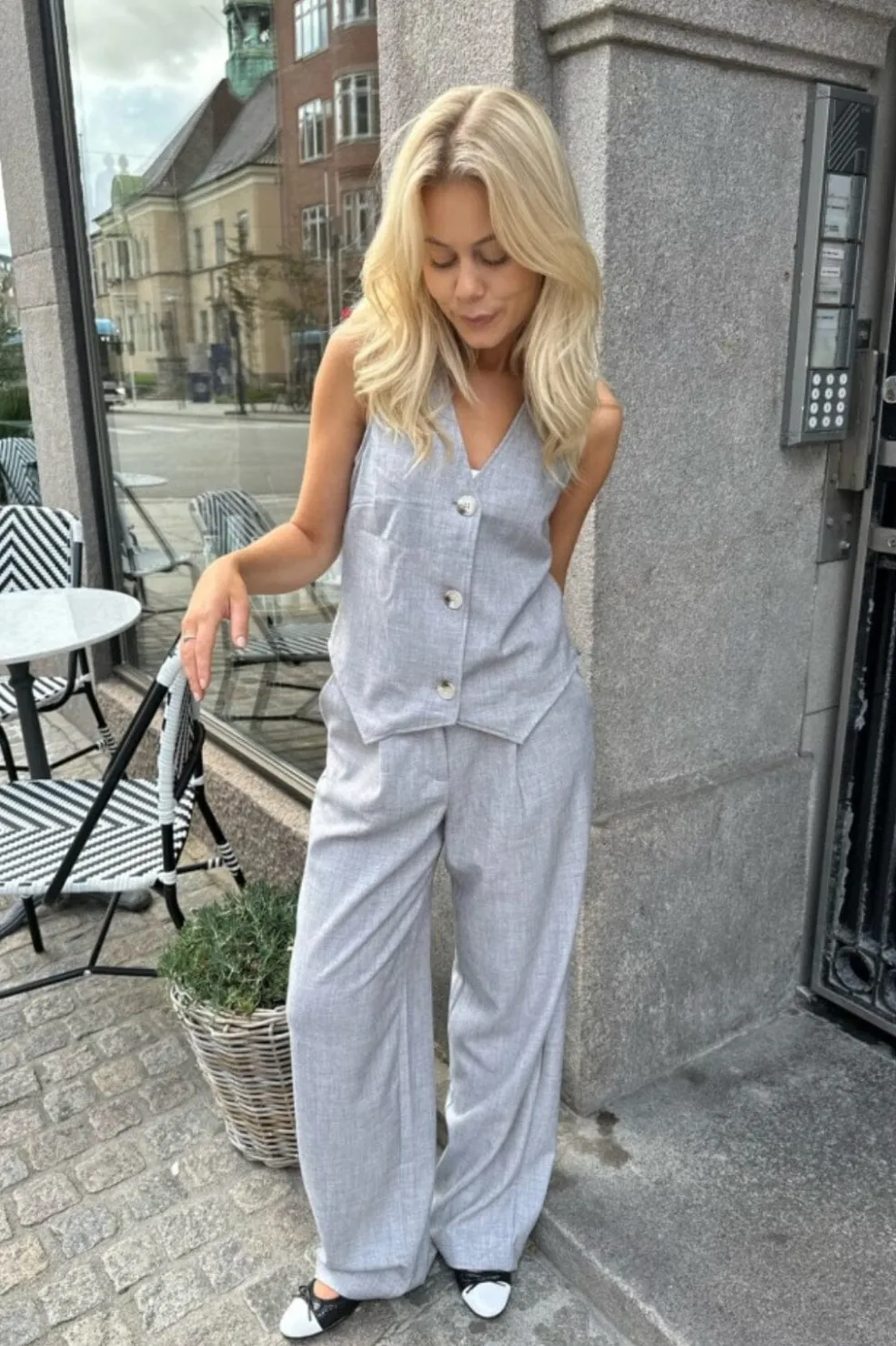 Grå bukser fra BYIC med vidt snit og skræddersyet design. Bukserne har en løs pasform og høj funktionalitet med både for- og baglommer. De kan styles med den matchende Celina-vest.
