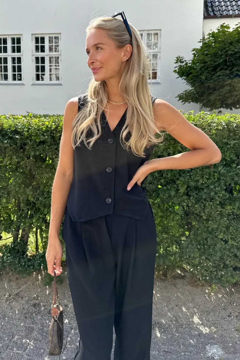 Sort vest fra BYIC med V-udskæring og to knapper foran. Den ærmeløse model er designet til at matche Celina-bukserne og har en lige pasform.