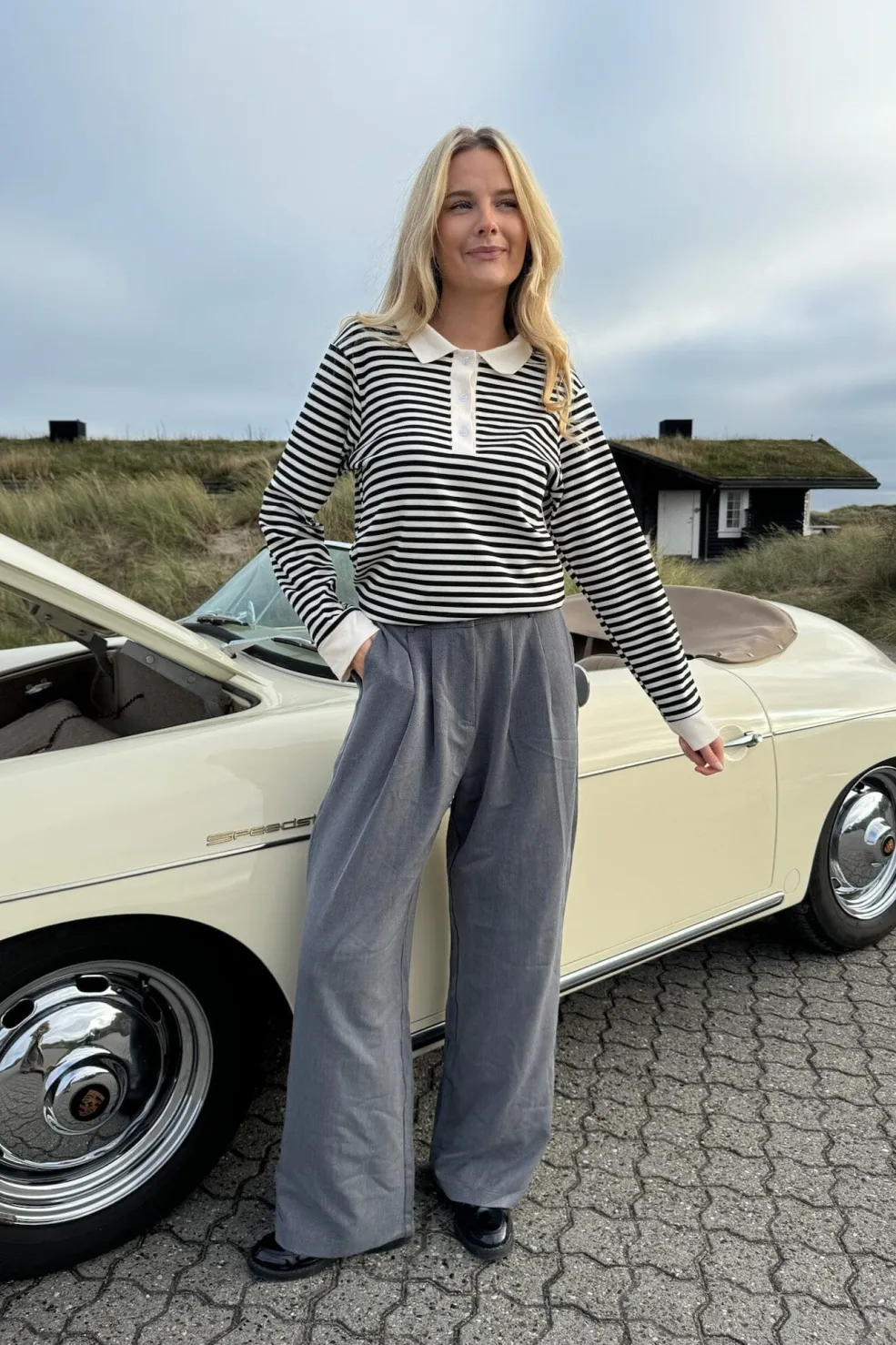 Grå bukser fra BYIC med bred pasform og høj talje. Bukserne har forlommer foran og falske baglommer bagpå. Den gulvlange stil kan kombineres med Celina-vesten.