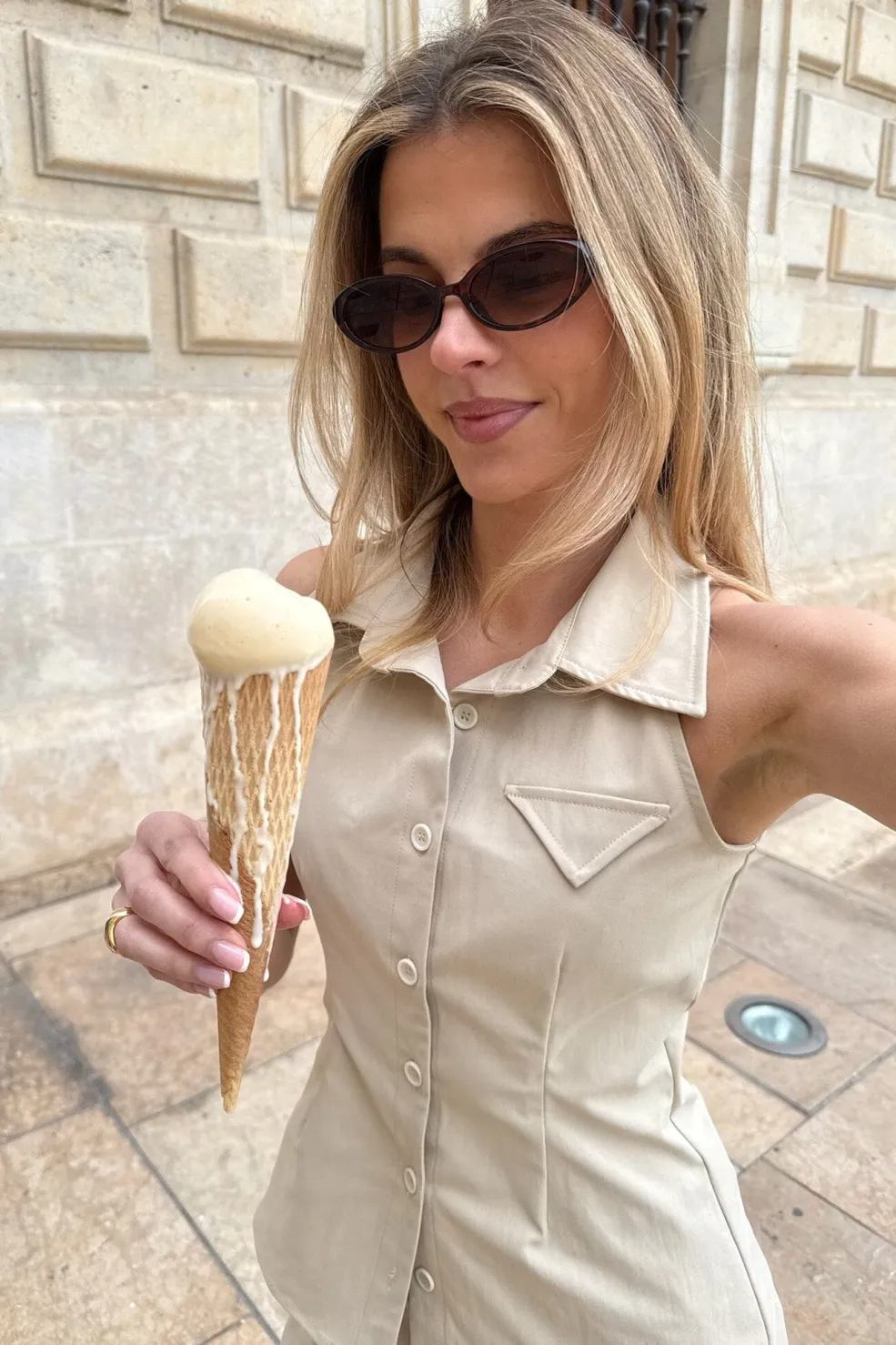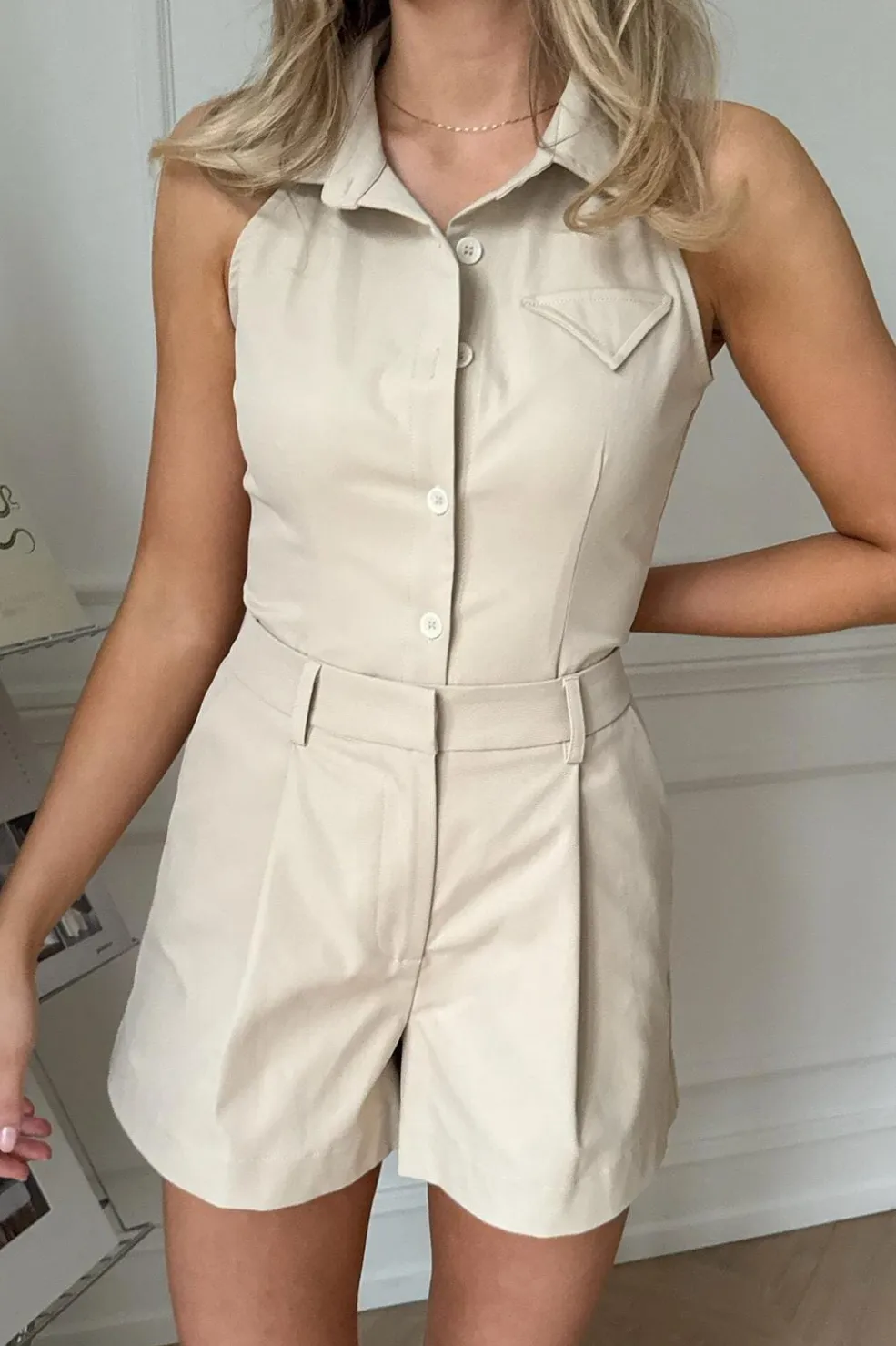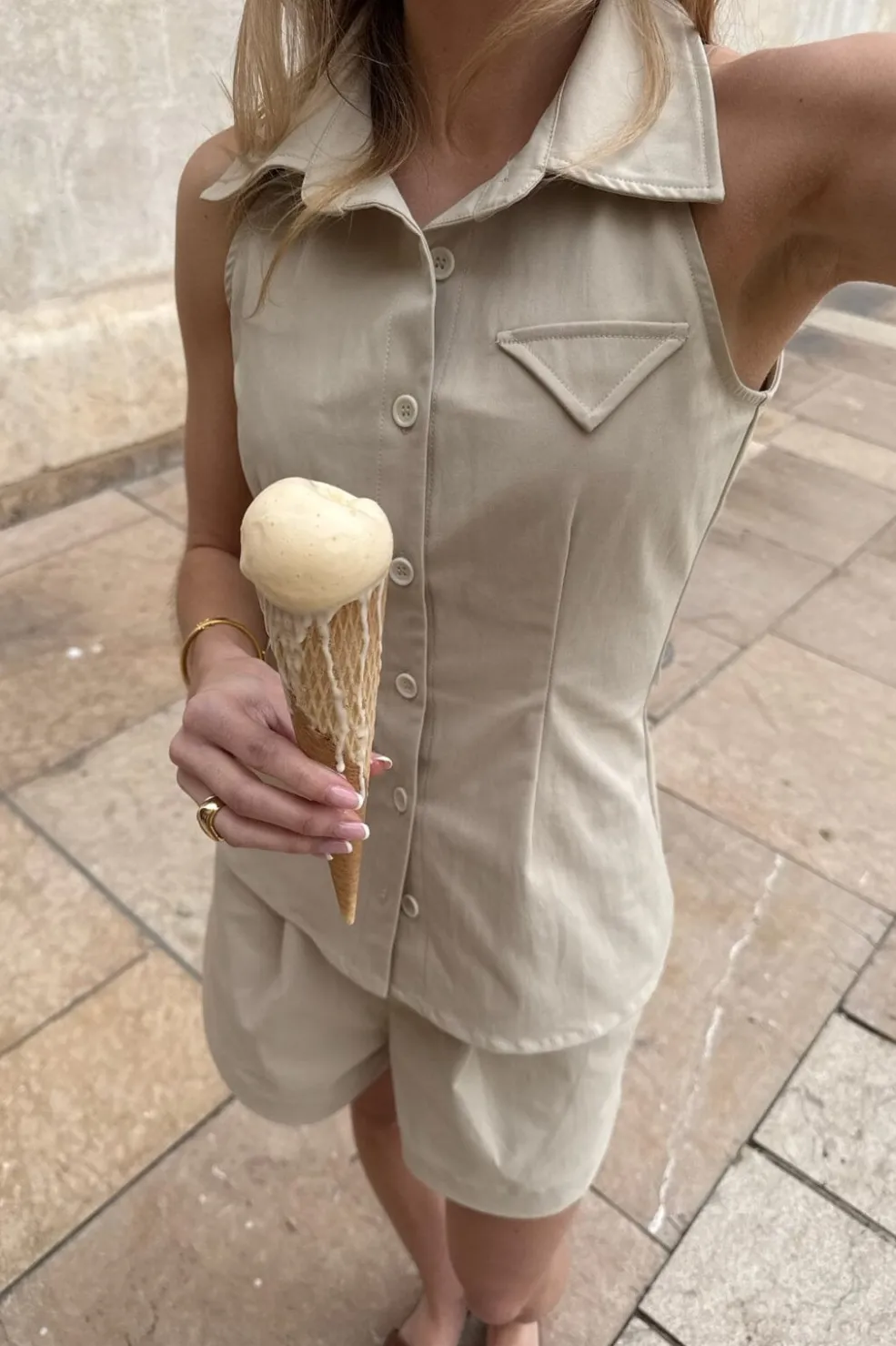 Beige top fra BYIC med skjortekrave og knapper hele vejen ned. Den ærmeløse model har dekorative syninger og en lomme på brystet med trekantet design.