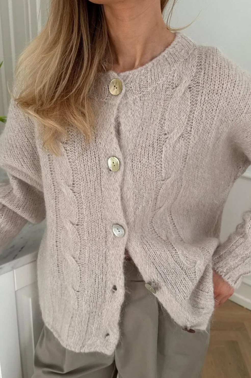 Beige cardigan fra BYIC med kabelstrik på forsiden. Den bløde strik har dekorative syninger og knapper i lysegrøn og creme, som giver et personligt præg.
