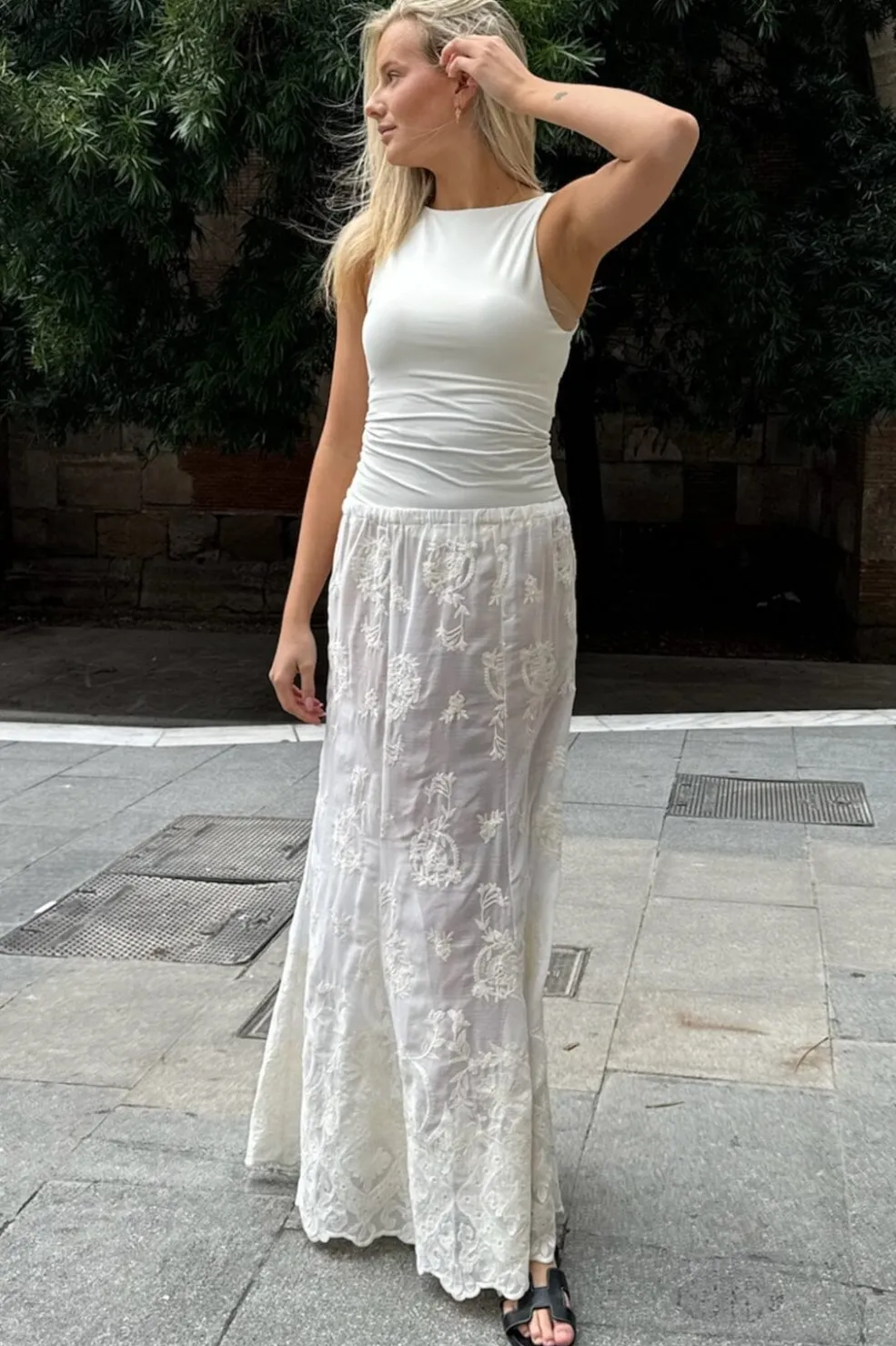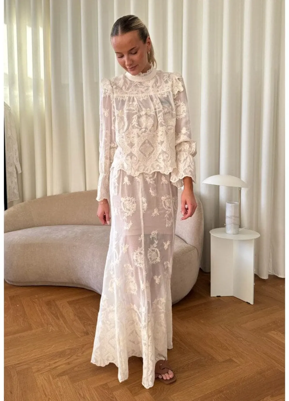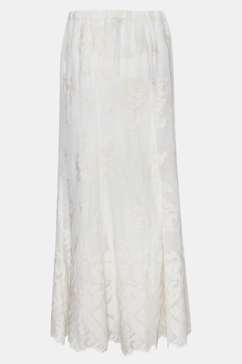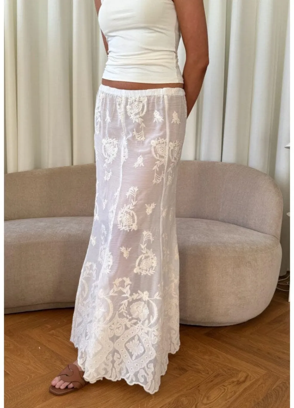 Lang nederdel fra BYIC i gennemsigtig hvid blonde. Den har et blomstret mønster og en lav talje med elastik. Skørtet er lavet i et let stof med broderede detaljer.