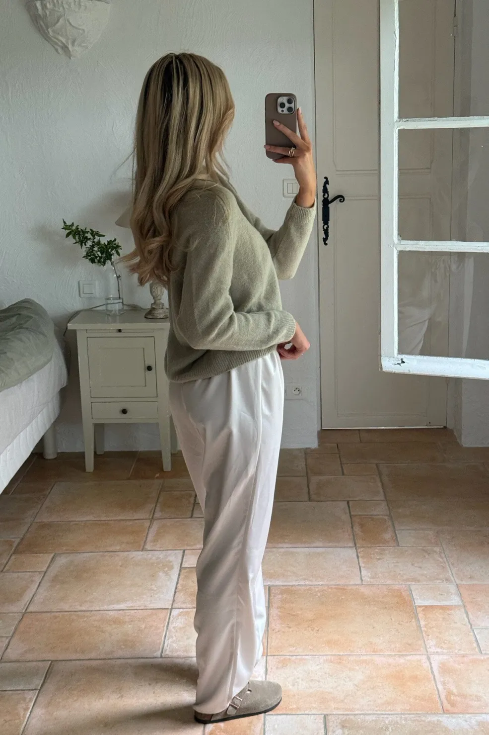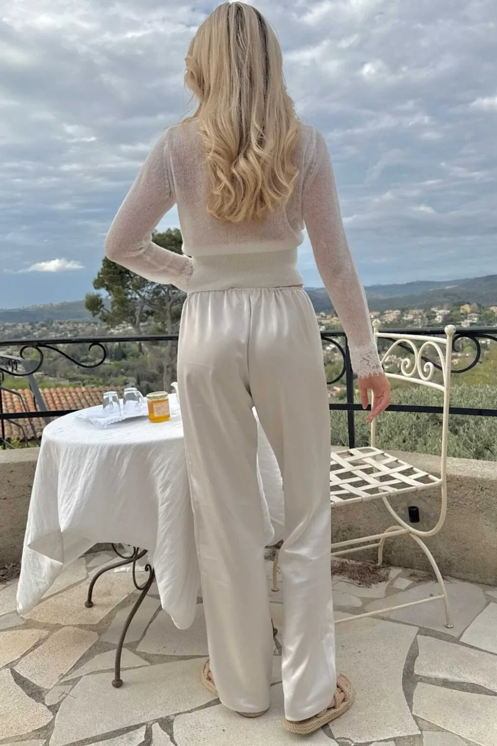 Bukser i off-white lavet af luksuriøs, elegant satin. De har en løs pasform og et bindebælte i taljen for justerbar komfort og stil.