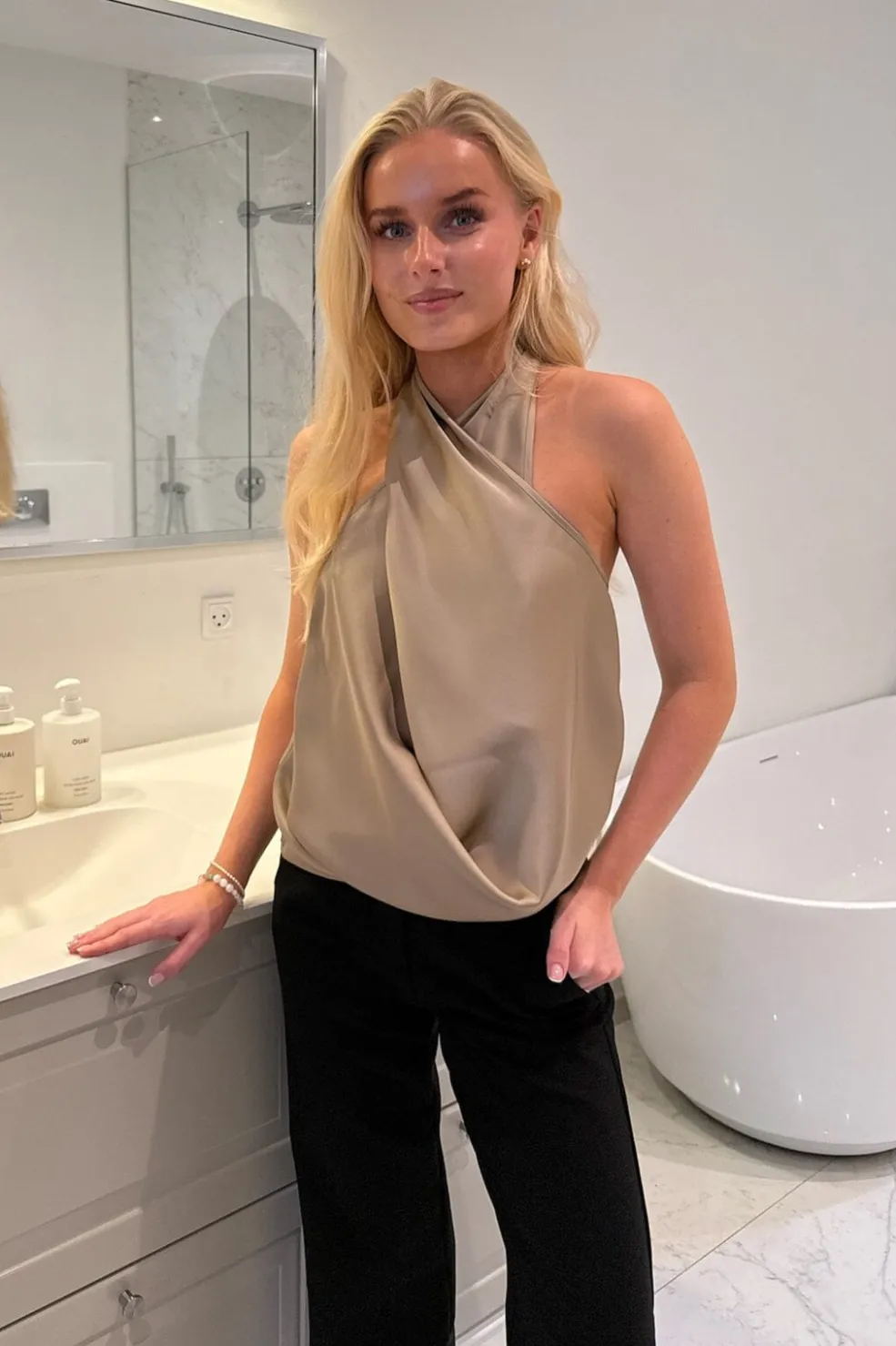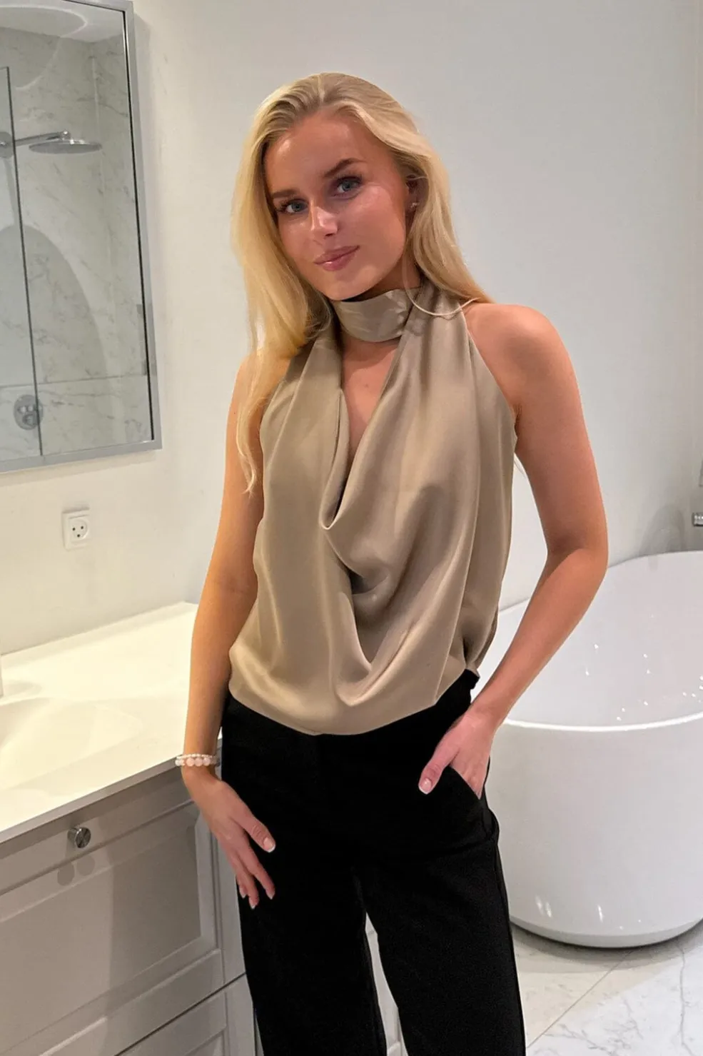 Champagnefarvet wrap-top fra BYIC med draperet front og høj hals. Toppen har en løs pasform og et skinnende udtryk med let fald i stoffet.