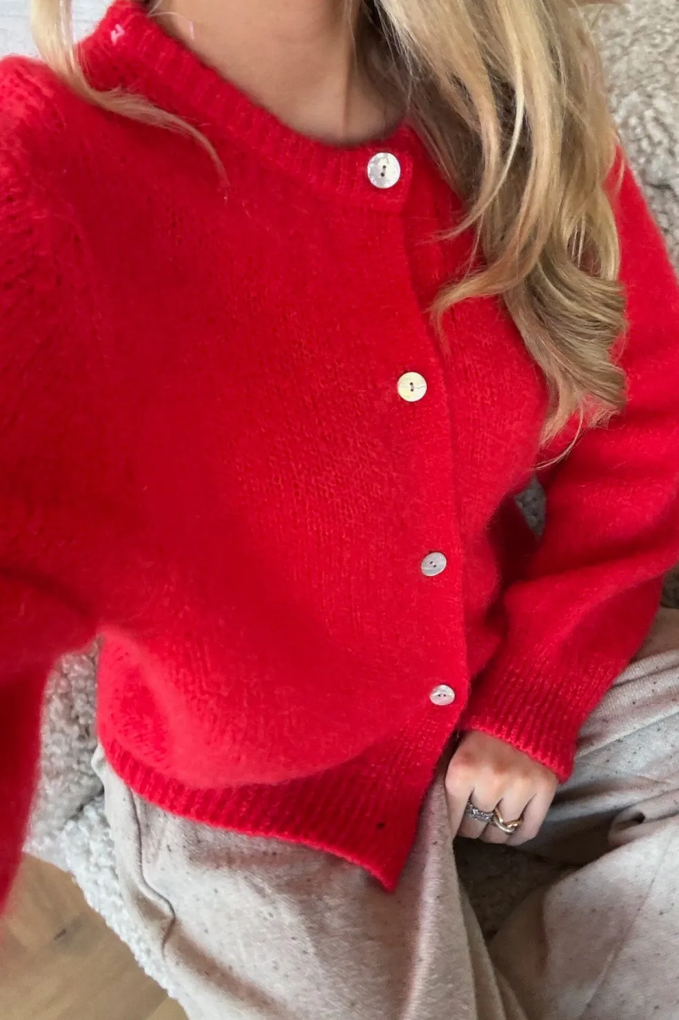 Fuzzy mohair cardigan med lange voluminøse ærmer, rib detaljer og perlemorslook på knapperne. Passer til størrelsen.