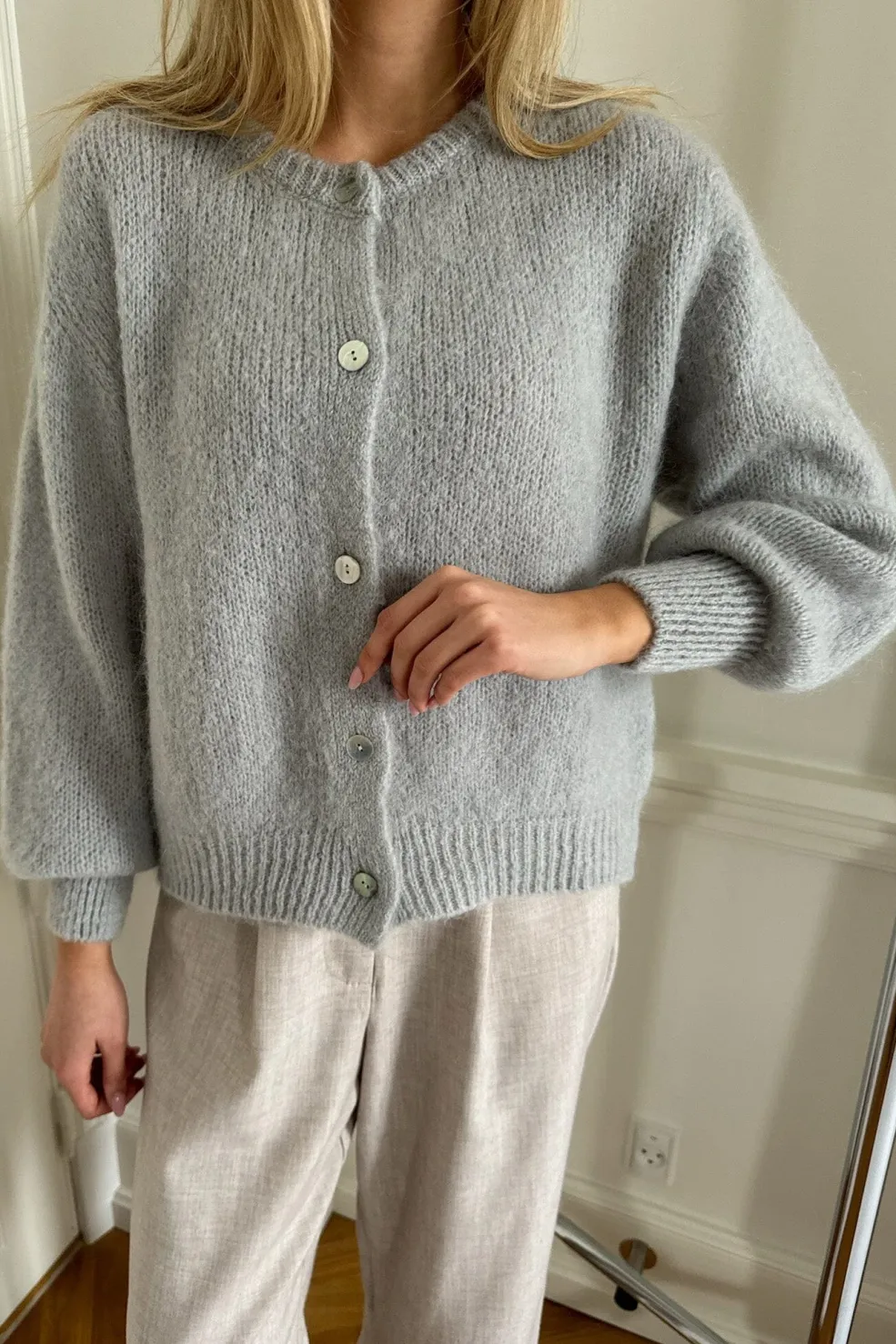 Grå cardigan med voluminøse ærmer og knapper med perlemorsudseende. Den bløde strik har en luftig tekstur og er stylet med en hvid t-shirt under.