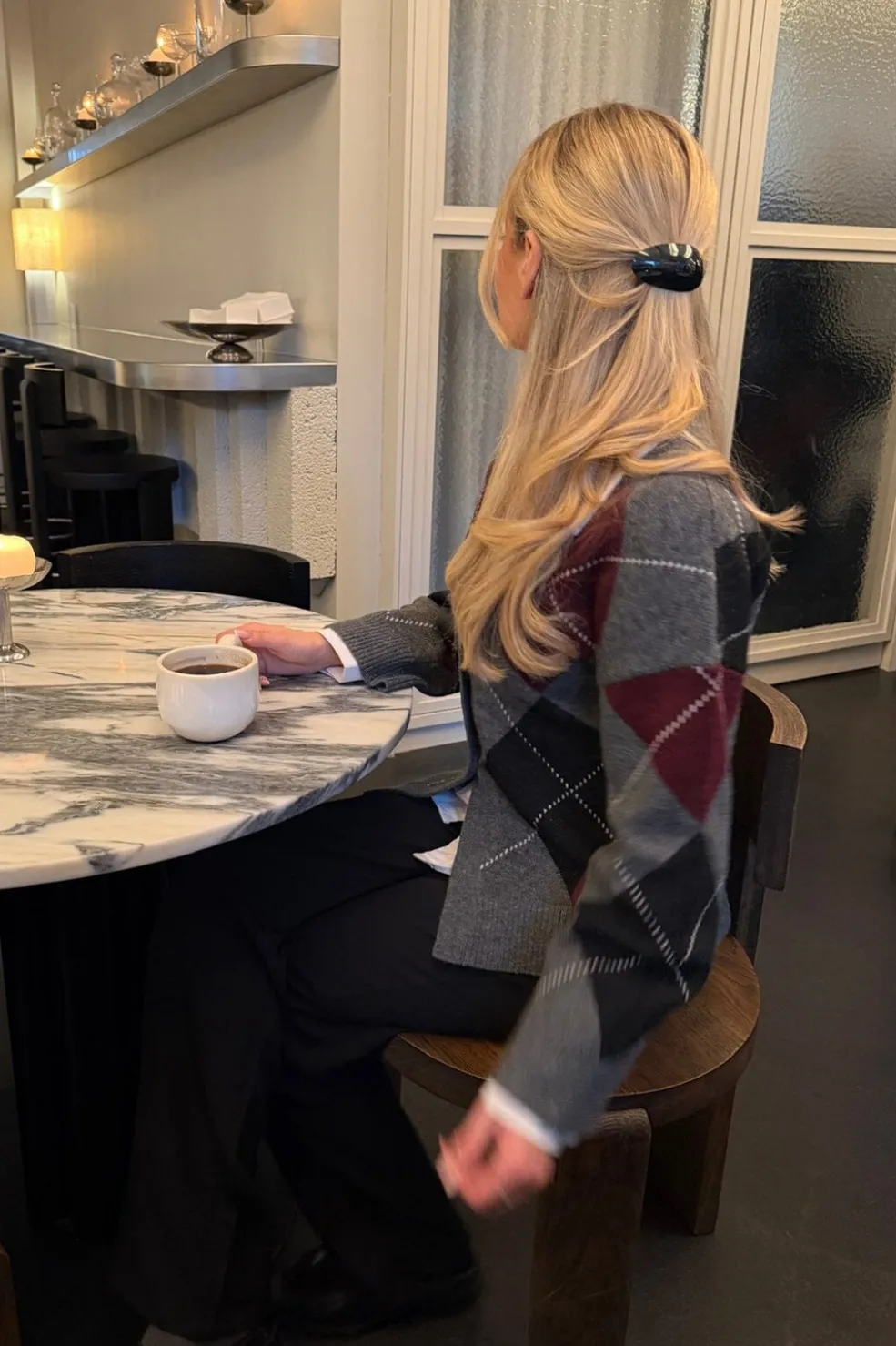 En ternet cardigan fra BYIC med et argyle-mønster i grå, rød og bordeaux. Cardiganen har en løs pasform og knaplukning.
