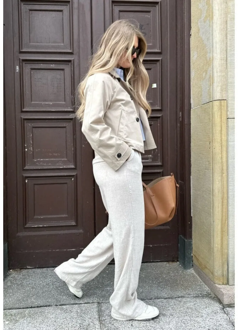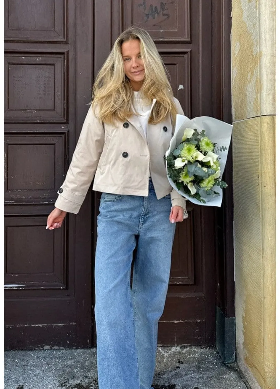 Kort trenchcoat fra BYIC i lys beige. Den korte model har store knapper og praktiske lommer. Jakken er lavet i en klassisk facon med rund hals og lange ærmer.