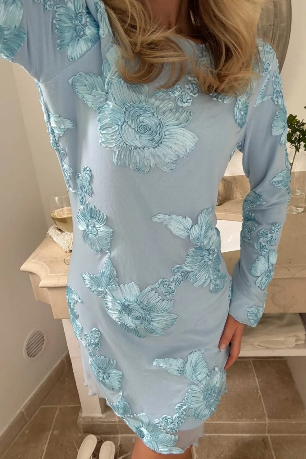 Elegant kort kjole i blå med en tætsiddende silhuet. Kjolen har lange ærmer og en rund halsudskæring. Den er udsmykket med 3D blomsterdetaljer overalt, hvilket tilføjer ekstra karakter til designet. Kjolens kanter er afsluttet med flæsedetaljer. Passer til størrelsen.