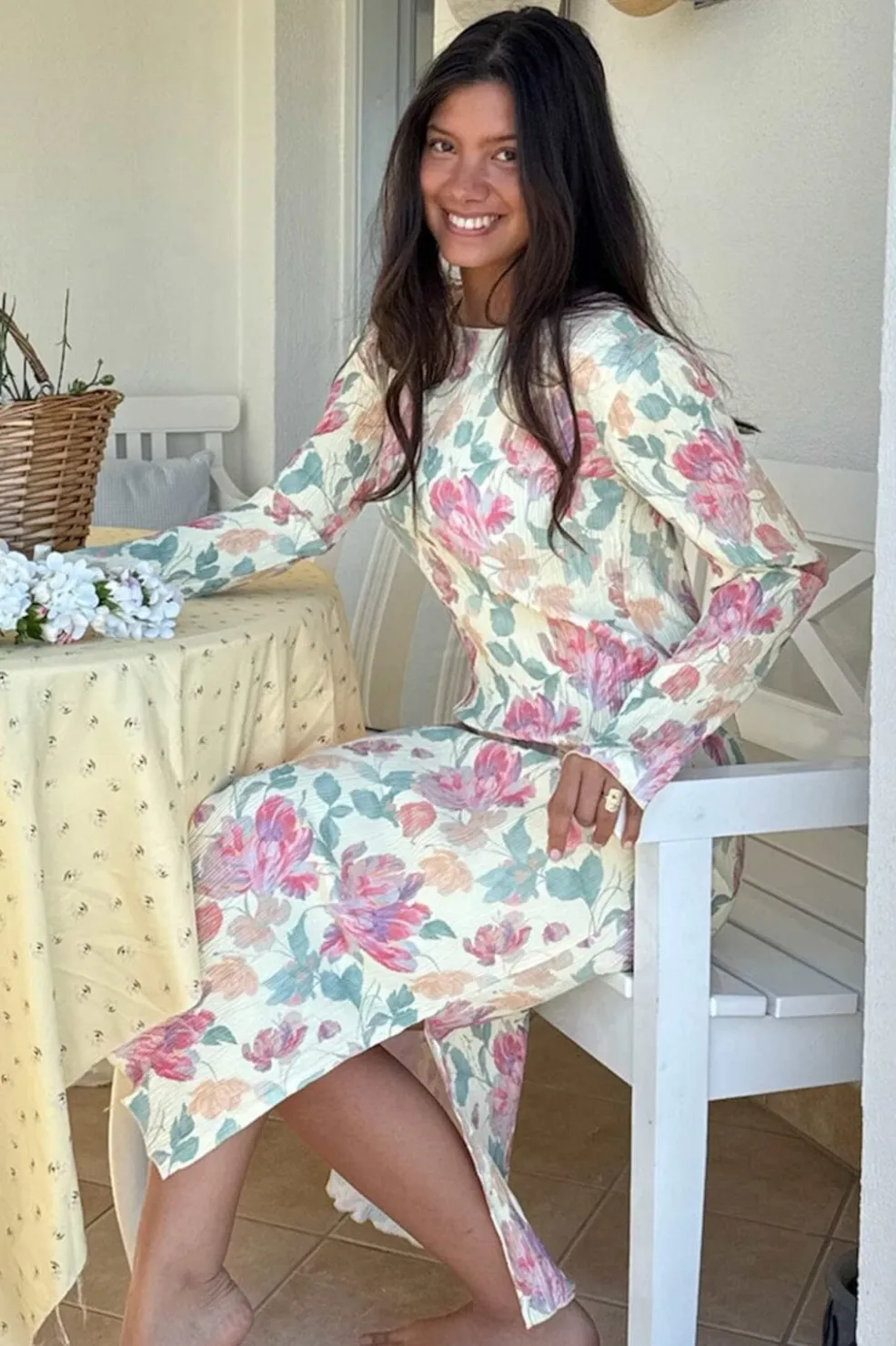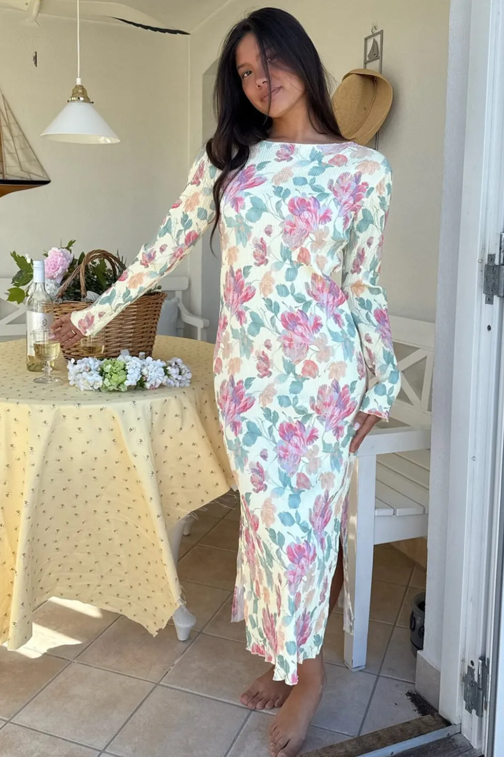 Smuk plissé kjole i pastelblomstermønster. Kjolen har lange ærmer og en rund halsudskæring, begge dekoreret med fine flæsedetaljer. Den har slidser i begge sider, hvilket tilføjer et elegant touch til designet.