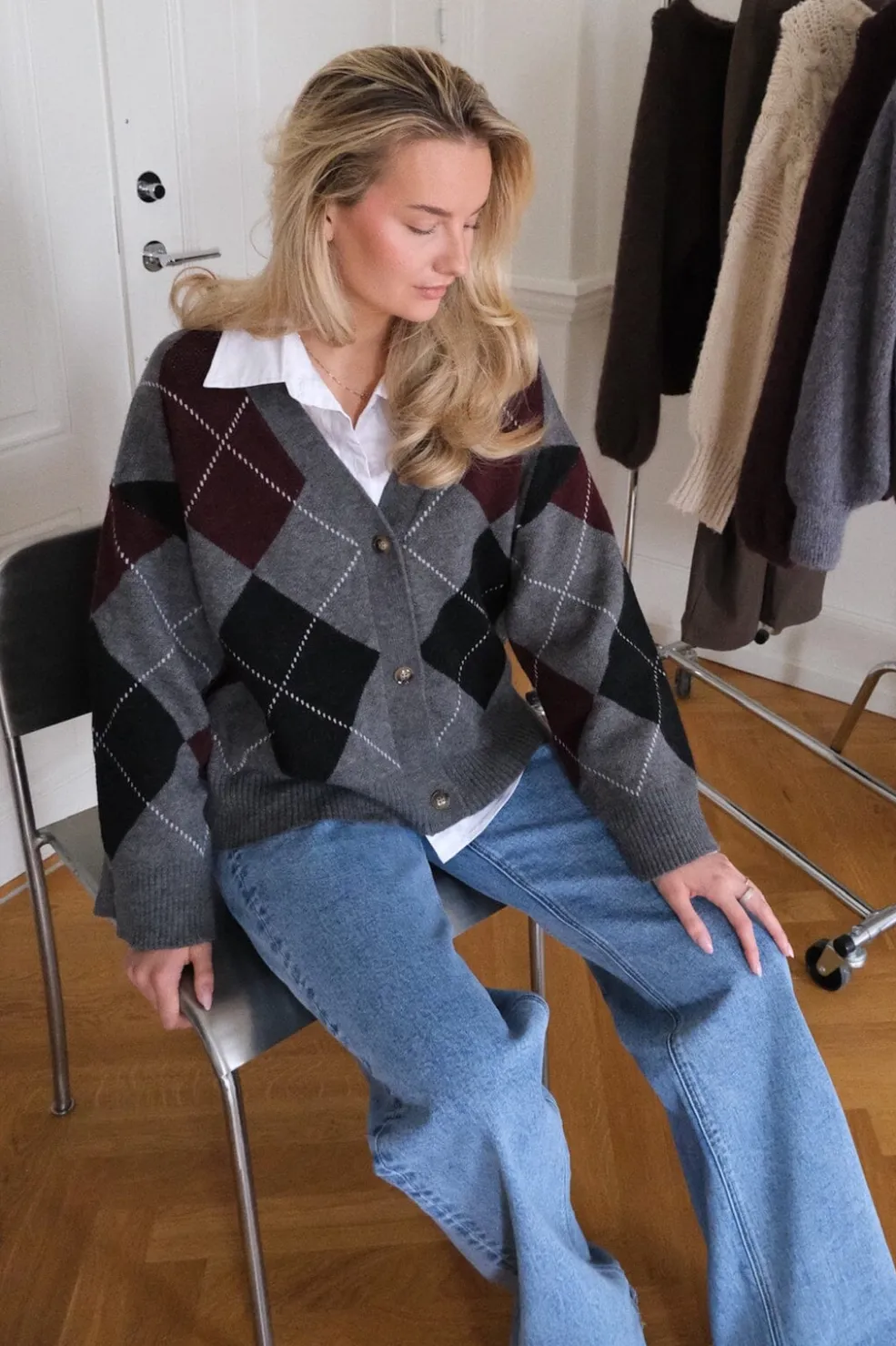 En grå cardigan fra BYIC med argyle-mønster i diamantformer. Cardiganen har lange ærmer, V-hals og knaplukning foran med synlige knapper.