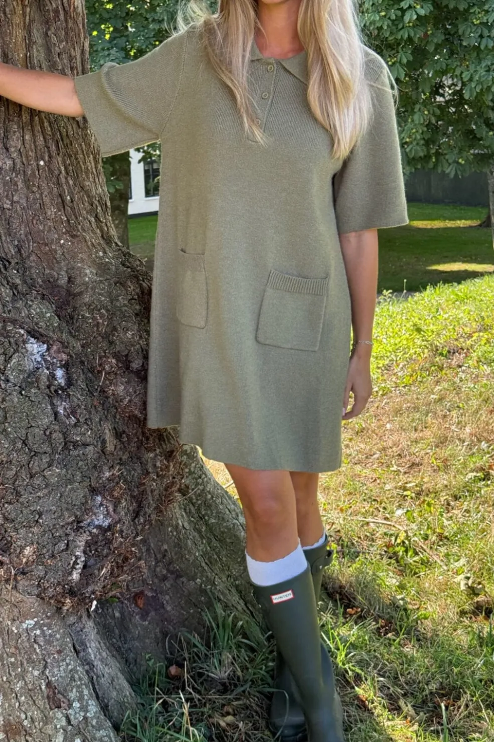 Strikkjole fra BYIC i armygrøn. Kjolen har en polo-krave med tre små knapper og to firkantede lommer foran.