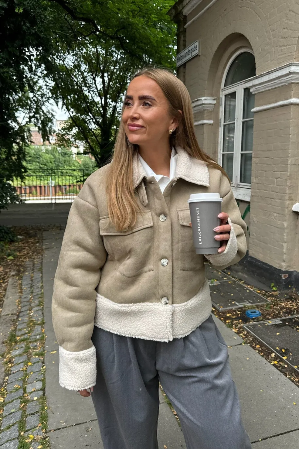 Sort og hvid quiltet jakke i en oversized pasform med blomsterprint i forskellige farver, to store lommer og knapper ned langs fronten. Passer til størrelsen.