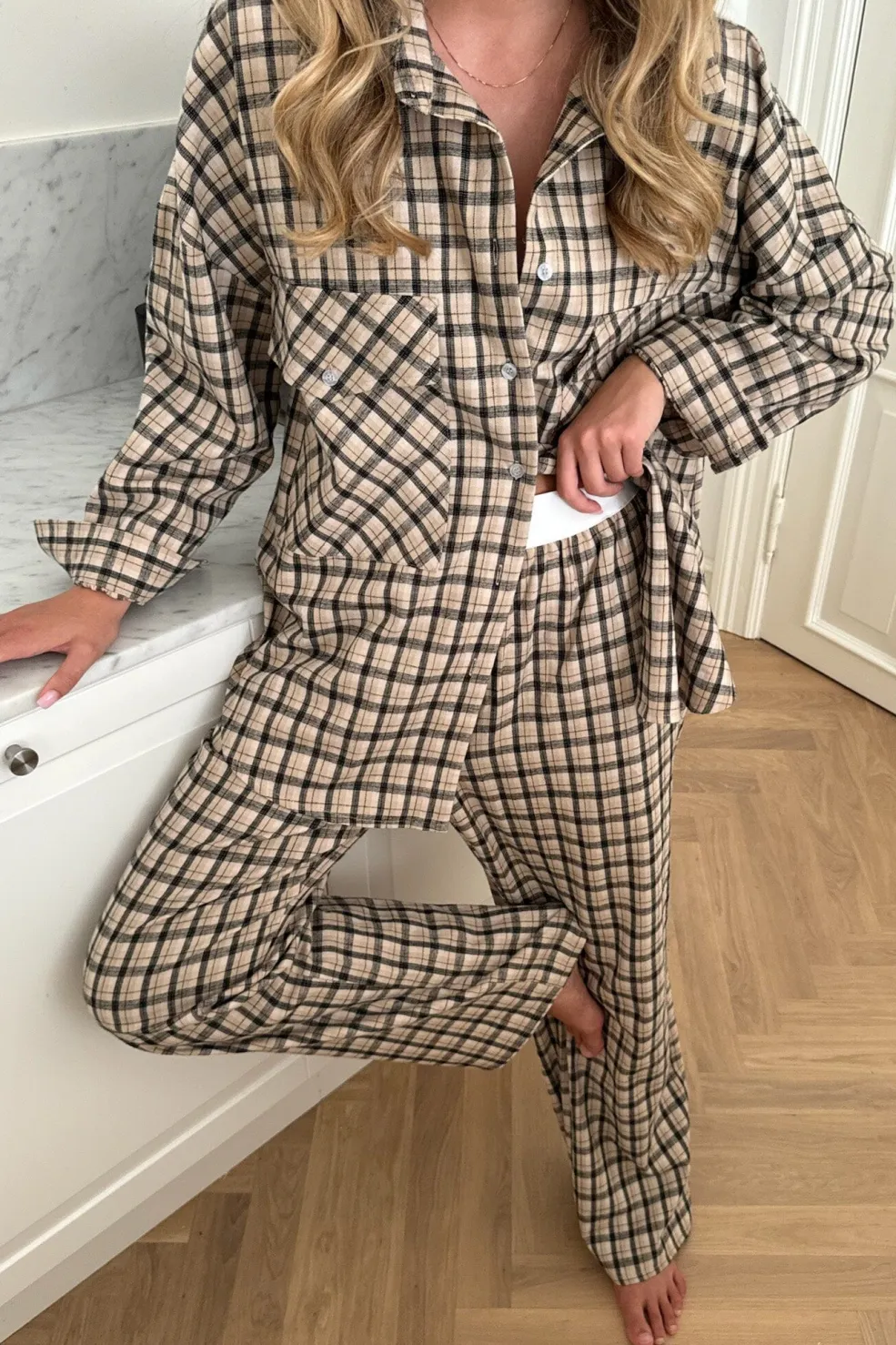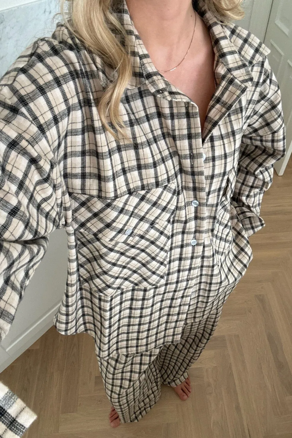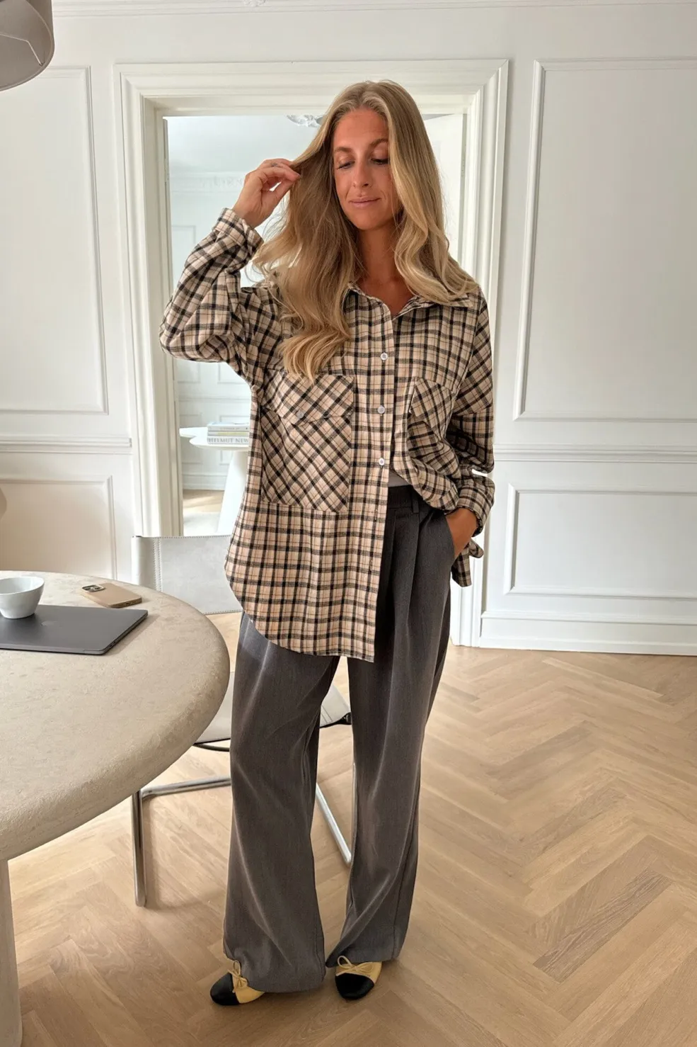 Ternet skjorte fra BYIC i beige og sort bomuldsstof. Skjorten har en løs pasform med store lommer foran og knapper hele vejen ned.