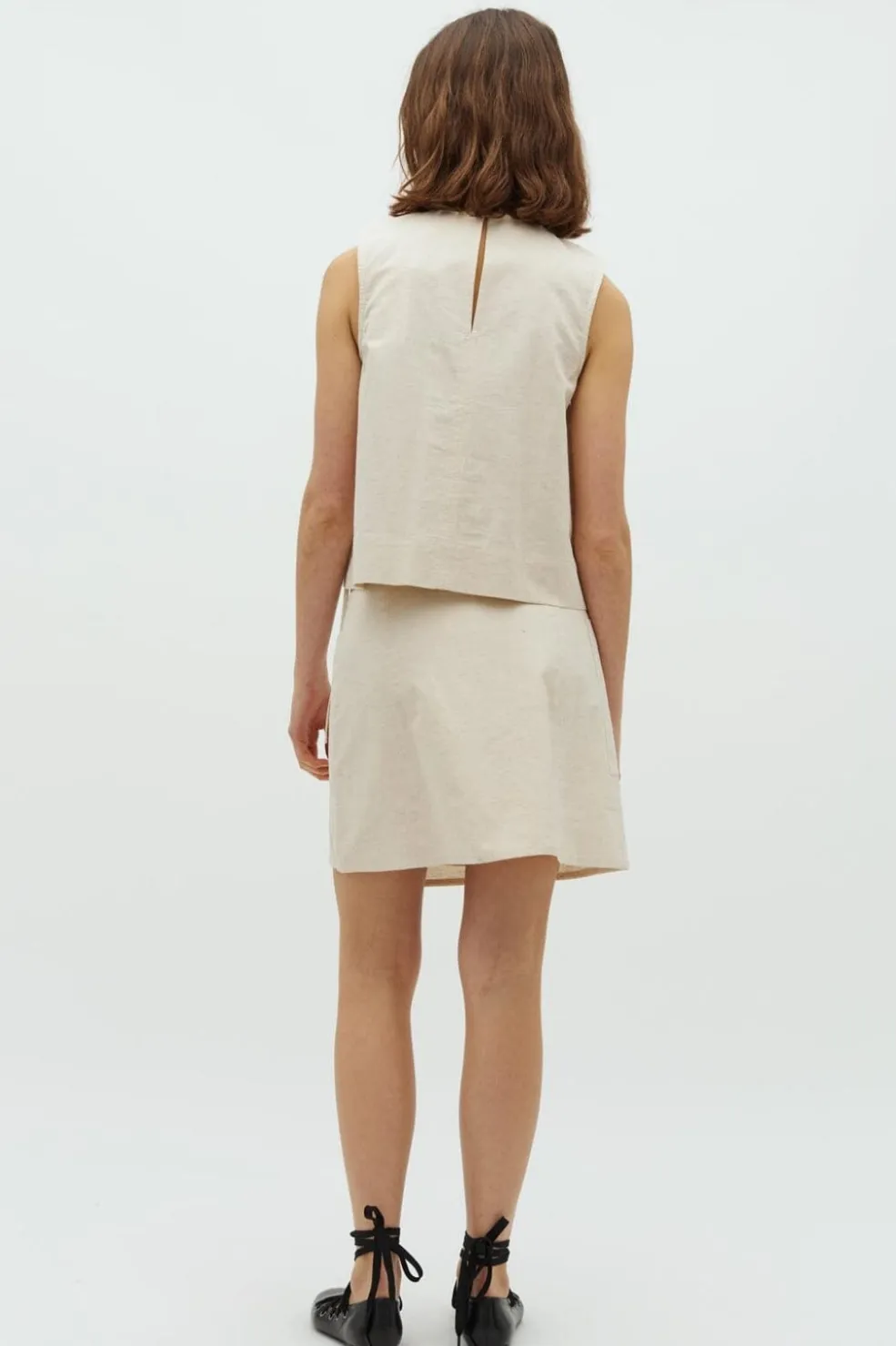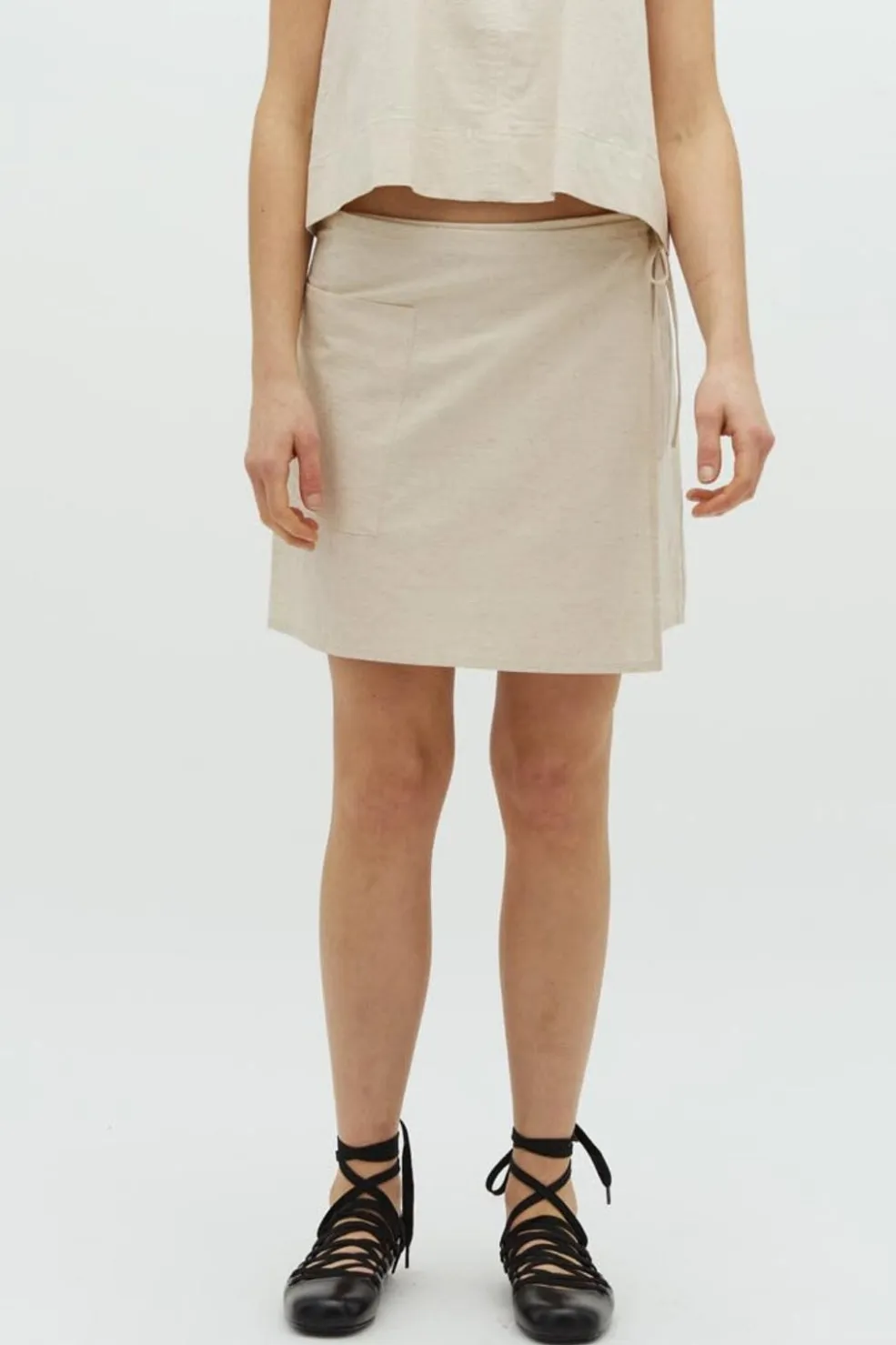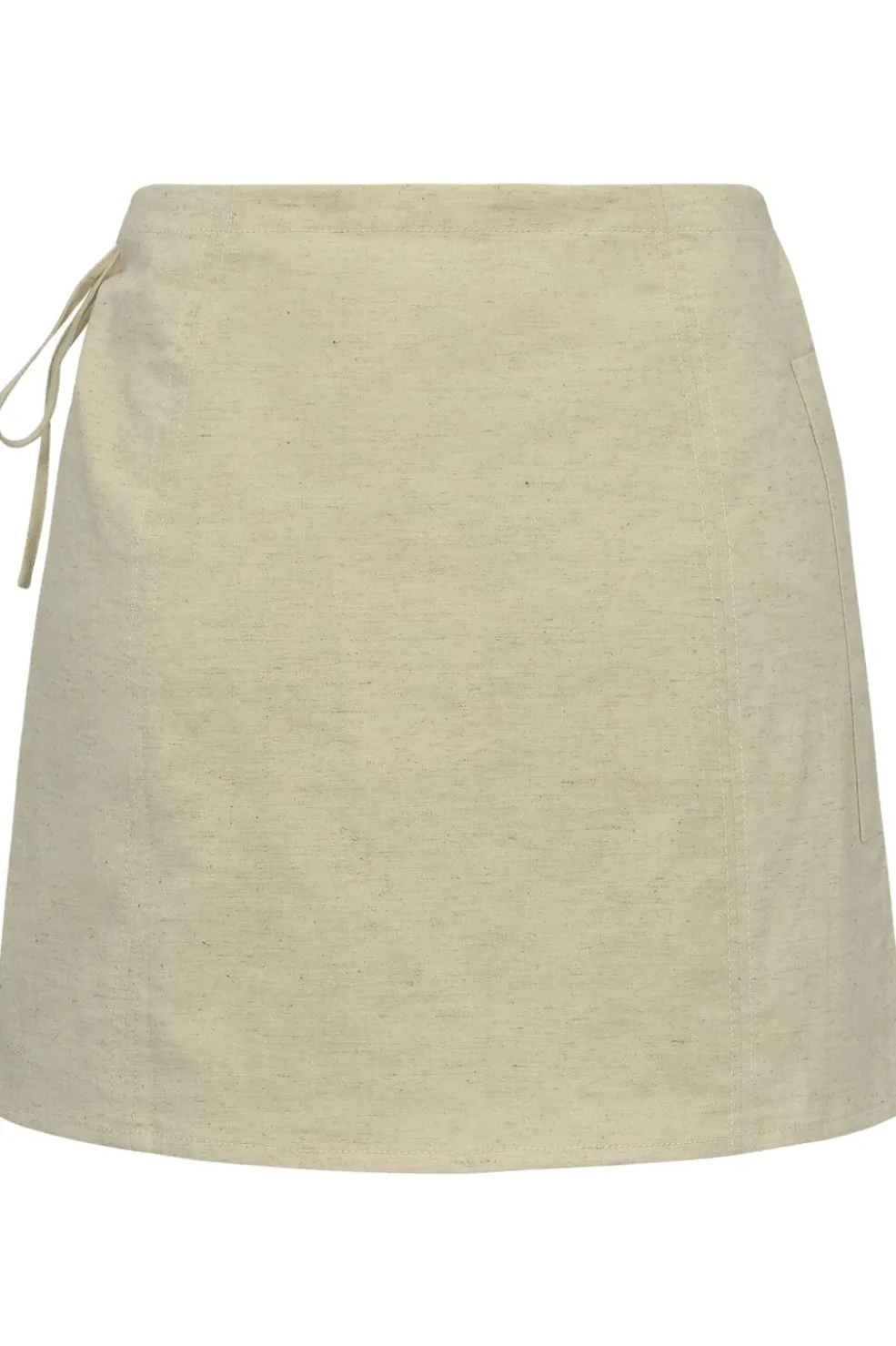 Beige nederdel fra Global Funk i en blanding af bomuld og hør. Nederdelen har en lomme på venstre side og bindebånd i taljen. Den går til midt på låret.