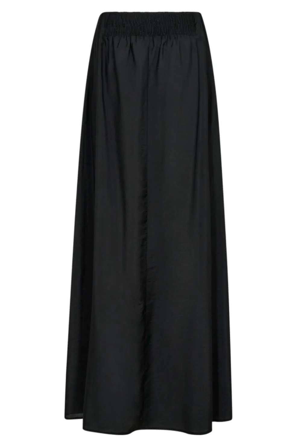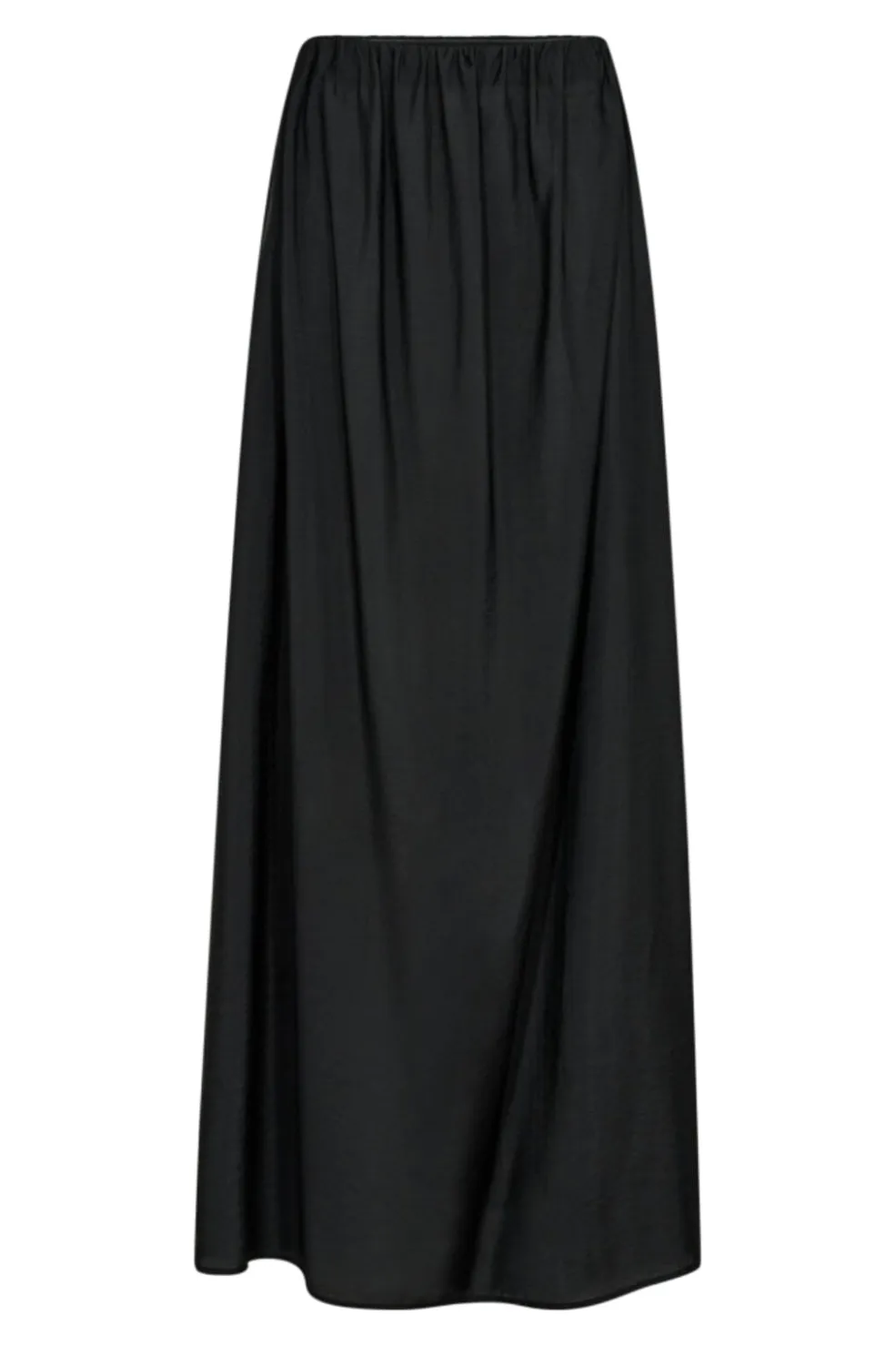 Sort tube-kjole fra Co´Couture med elastisk talje og off-shoulder-design. Kjolen er lang og har et flydende fald, der bevæger sig med kroppen.