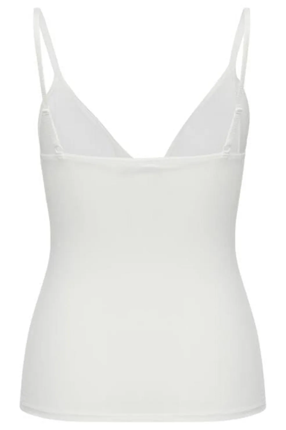 Hvid top fra Gestuz med tynde, justerbare stropper. Toppen har en dyb V-hals og en tætsiddende pasform, der følger kroppens linjer.