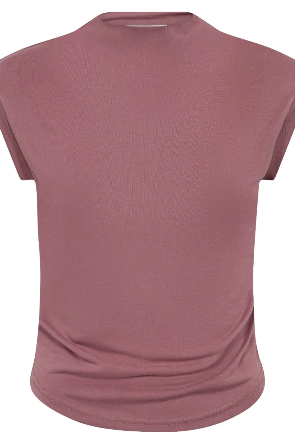 T-shirt fra Co’Couture i en rosenrød nuance. Den har rund halsudskæring og korte cap-ærmer. Materialet er en blød blanding af modal og polyester med et let fald.