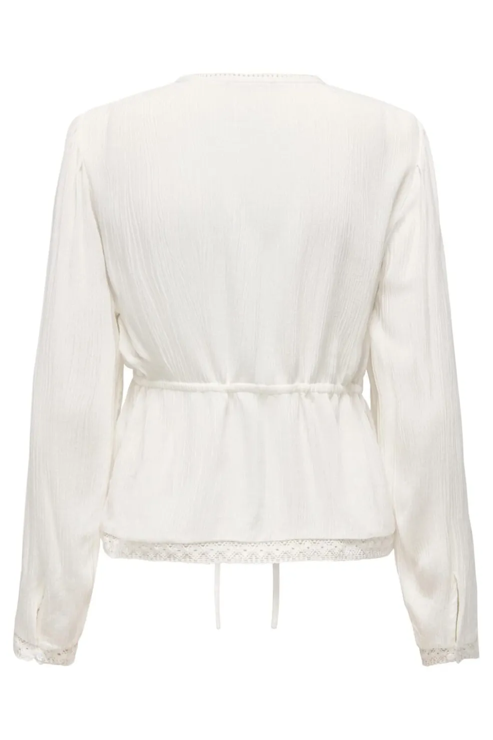 Forvandl dit hverdagsoutfit på et sekund ved at tilføje en feminin top, som sikrer et blødt, rent udtryk.- Produkttype: Onesize top – Hals: O-hals – Ærme: Lange ærmer – Lukning: Knaplukning – Detaljer: Snøre i taljen, broderet detalje – Pasform: Regular fit