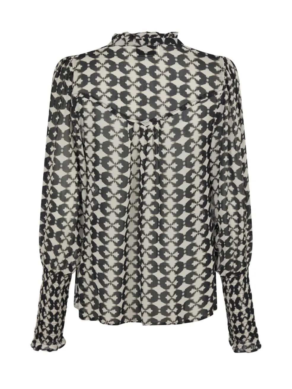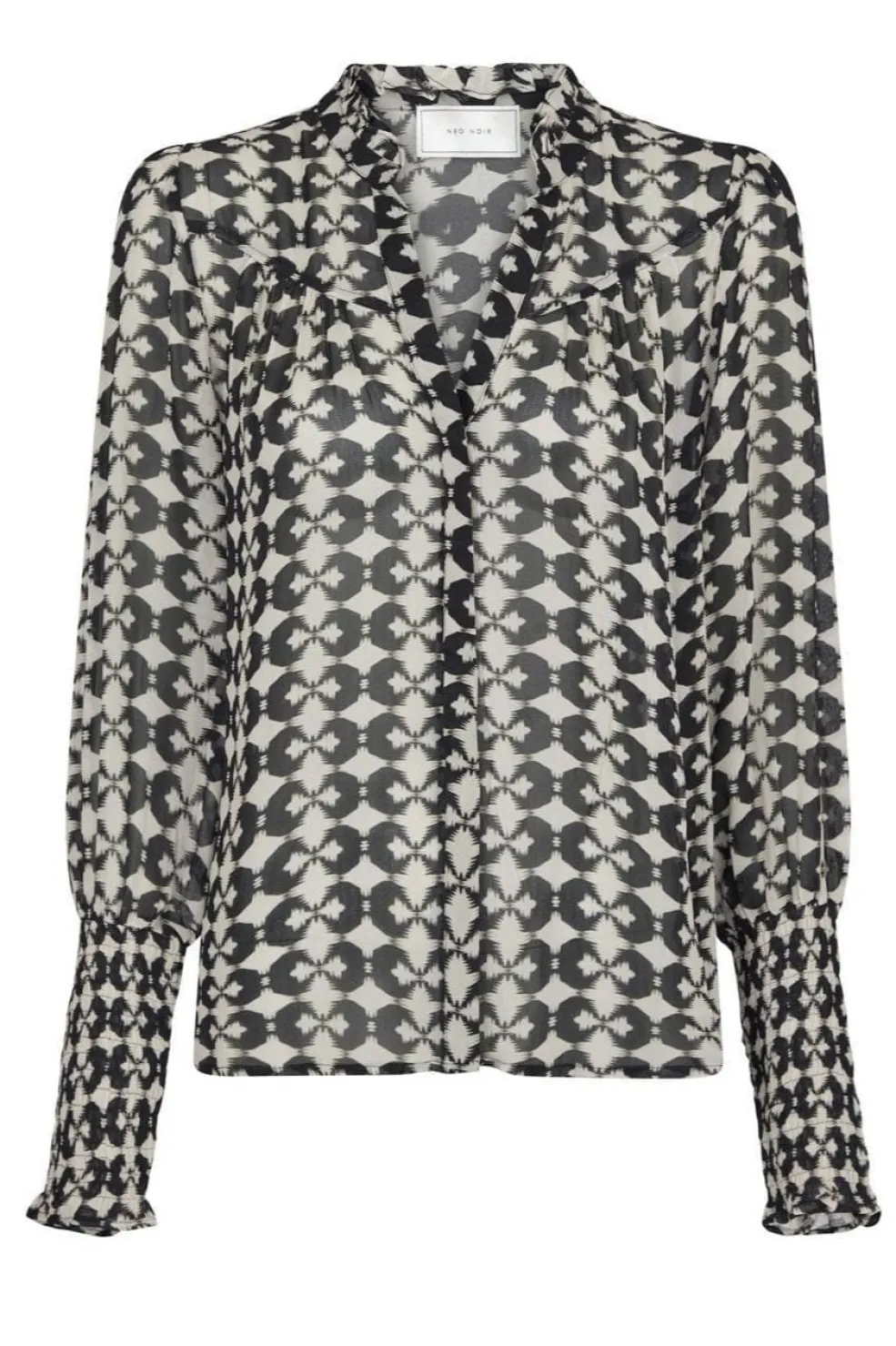 Sort skjorte fra Neo Noir med grafisk sort-hvidt mønster. En skjorte med V-hals og lange ærmer, der kan styles med både jeans og nederdel.