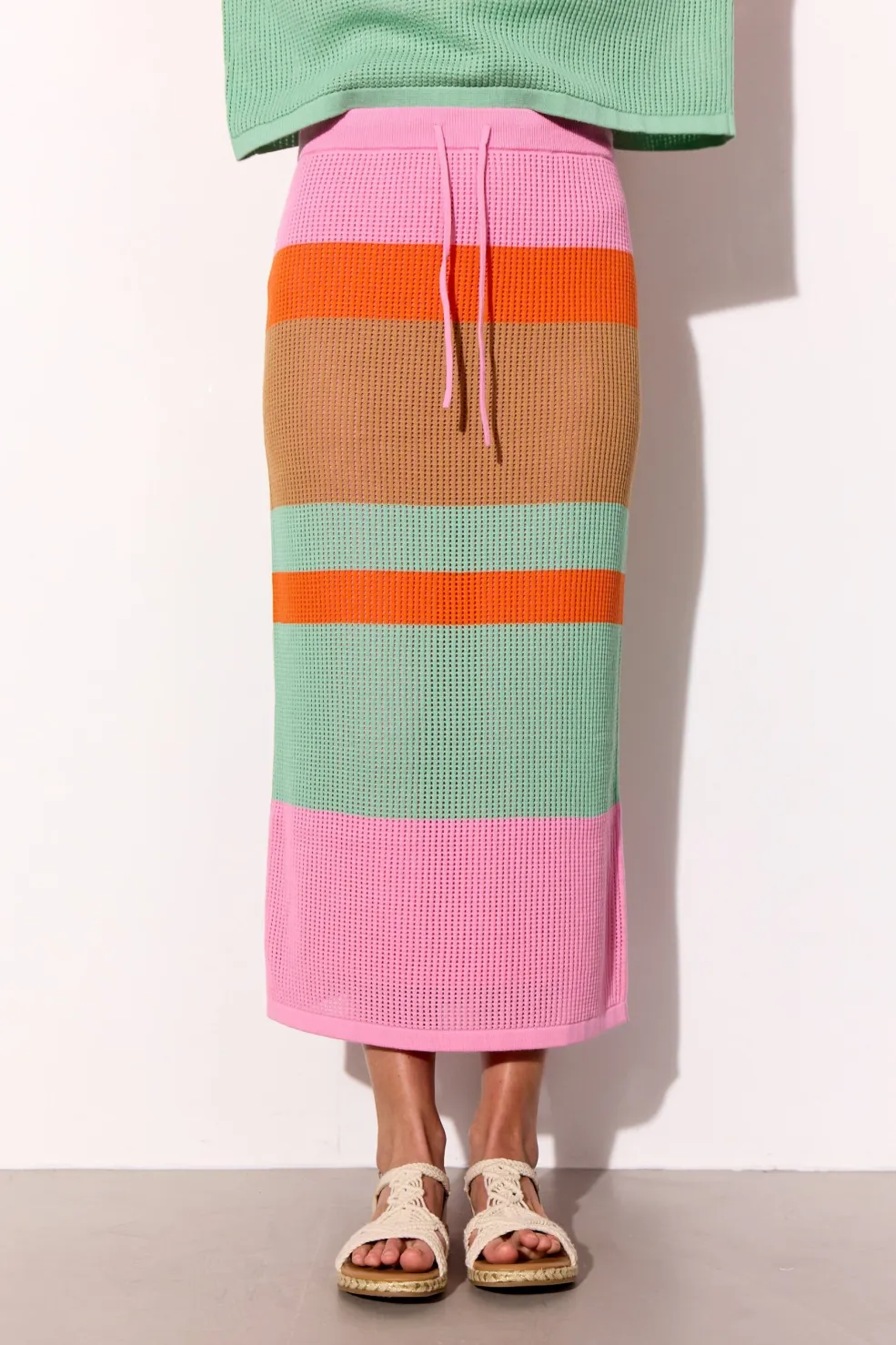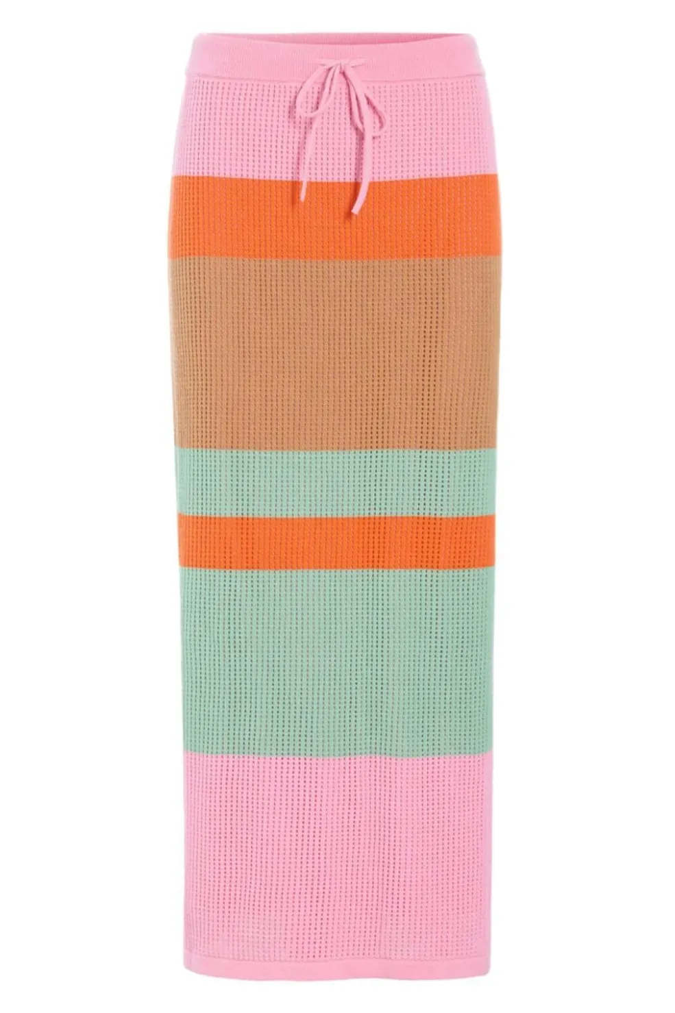 En stribet nederdel fra Hunkøn i lyserød, grøn og orange. Nederdelen er strikket i 100 % bomuld og har en længde til læggen.