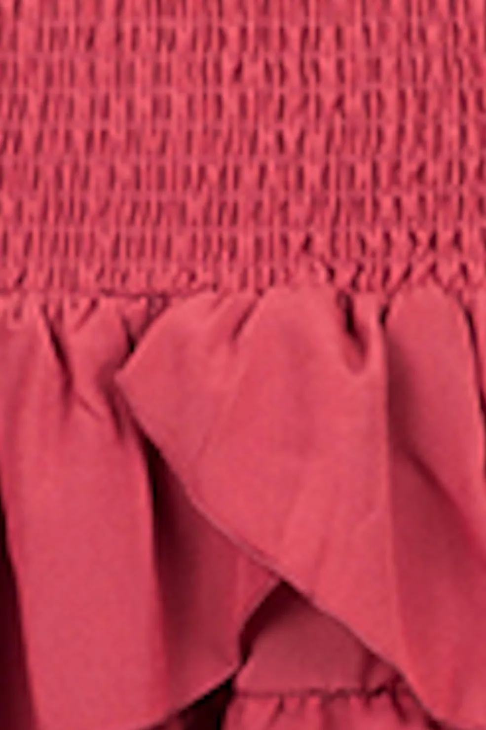 Kort nederdel fra Neo Noir i hindbærrød. To lag flæser og sløjfedetaljer giver nederdelen et legende udtryk. Den høje talje med smock skaber en god pasform.